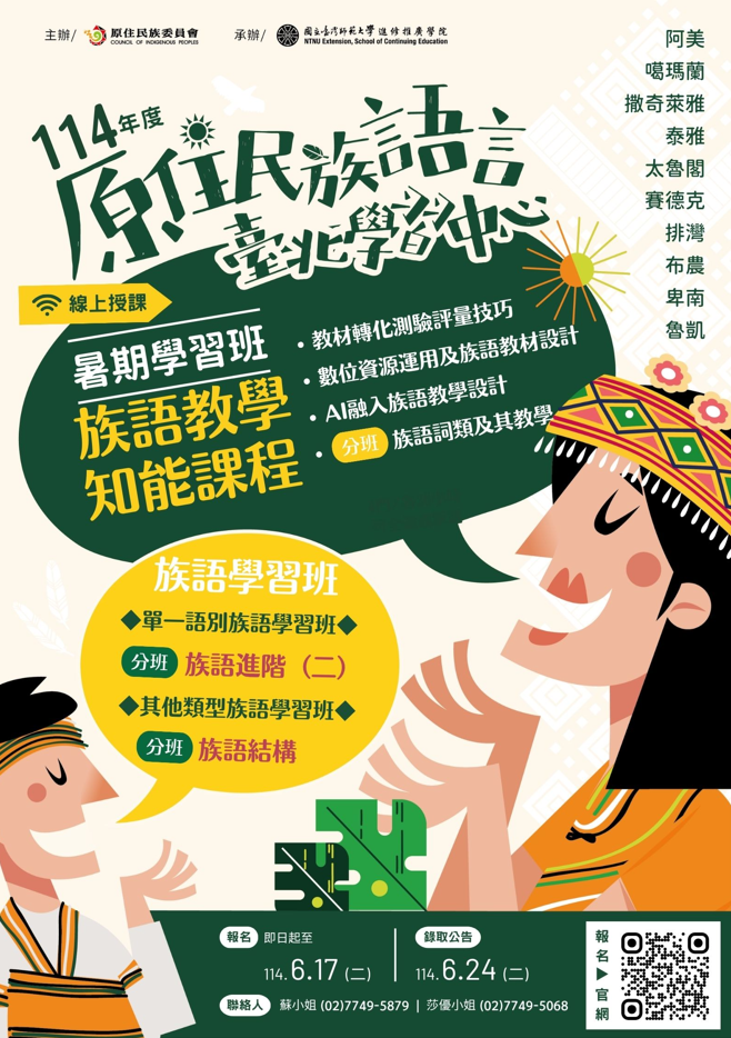 ★本班招生對象針對有意從事阿美族、噶瑪蘭族、撒奇萊雅族、泰雅族、太魯閣族、賽德克族、排灣族、布農族、卑南族、魯凱族等族語教學或語言推動工作者。