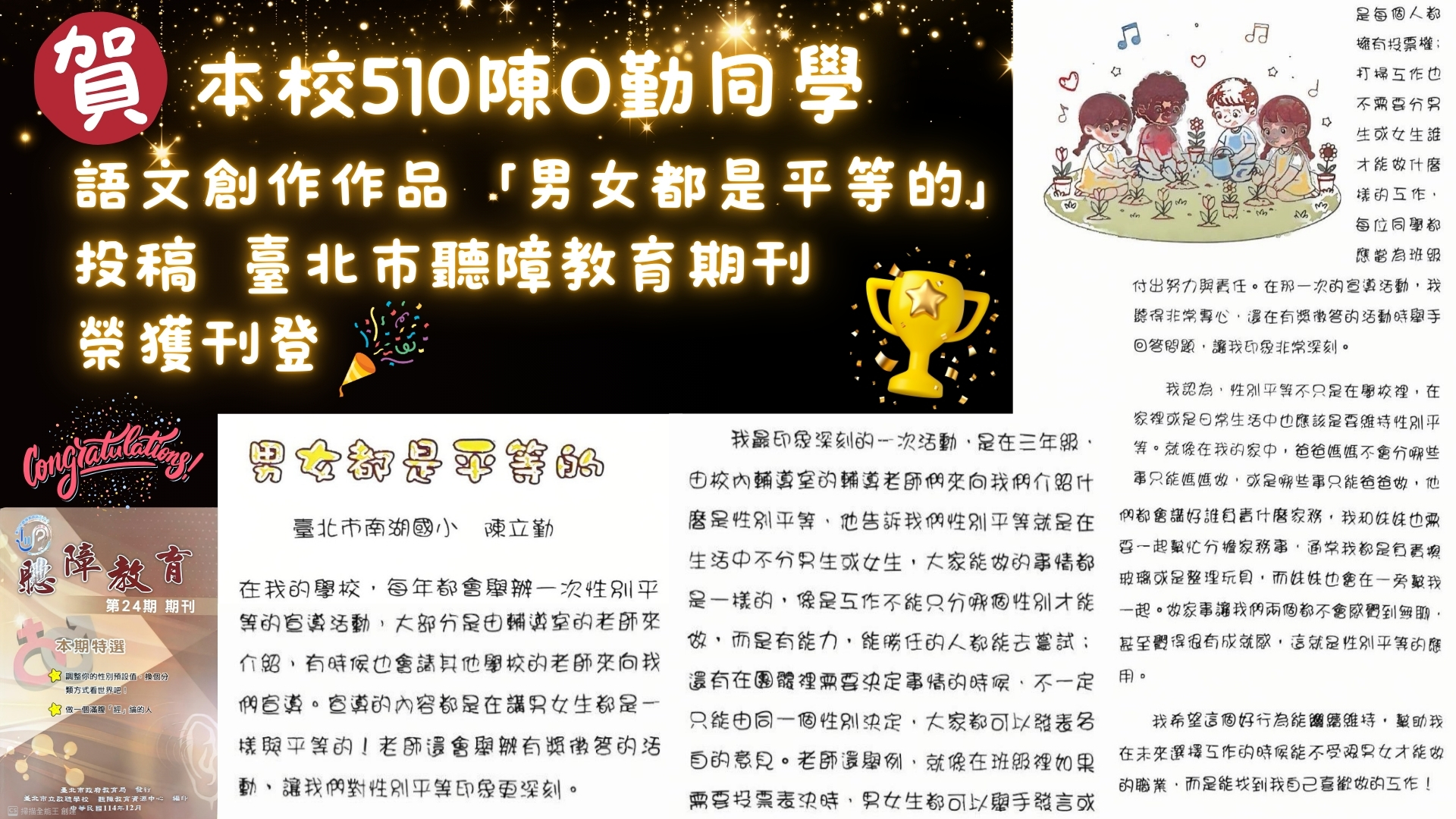 恭喜本校510陳O勤同學語文創作作品「男女都是平等的」投稿 臺北市聽障教育期刊榮獲刊登!感謝吳智仁老師指導Y