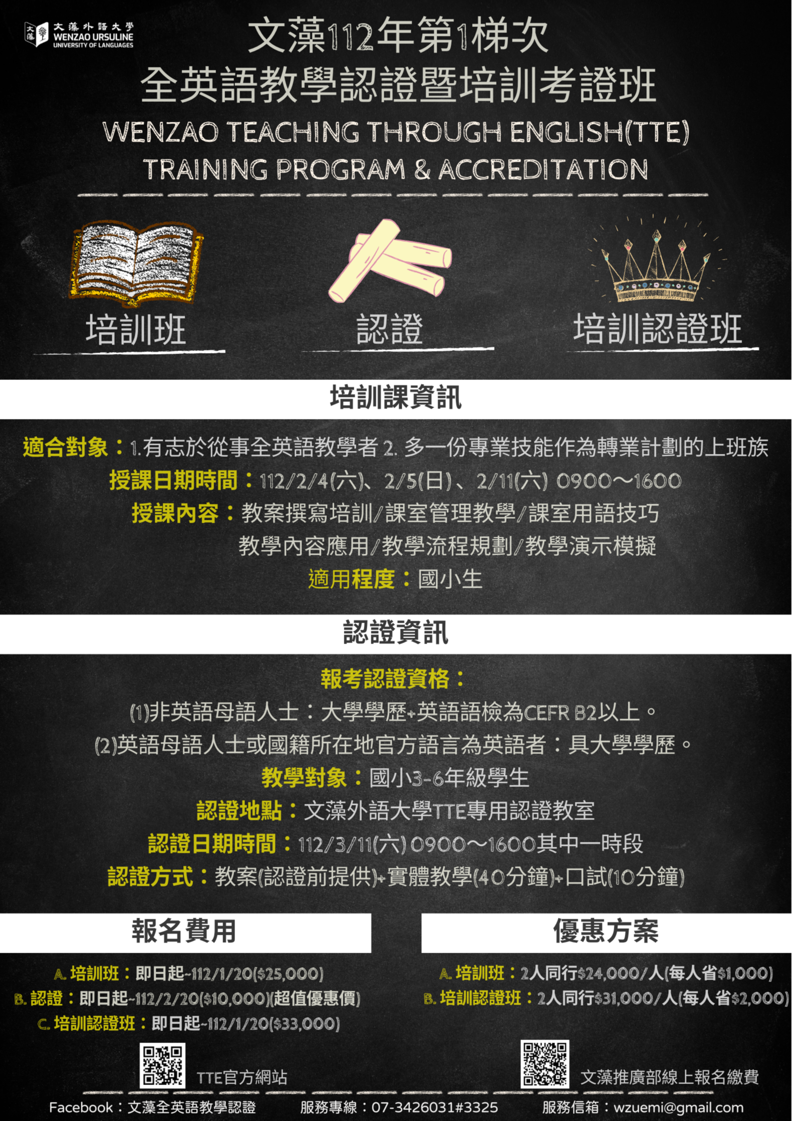 二、課程特色: (一)為台灣首創之全英語教學師資認證暨培訓課程(全英語授 課)。