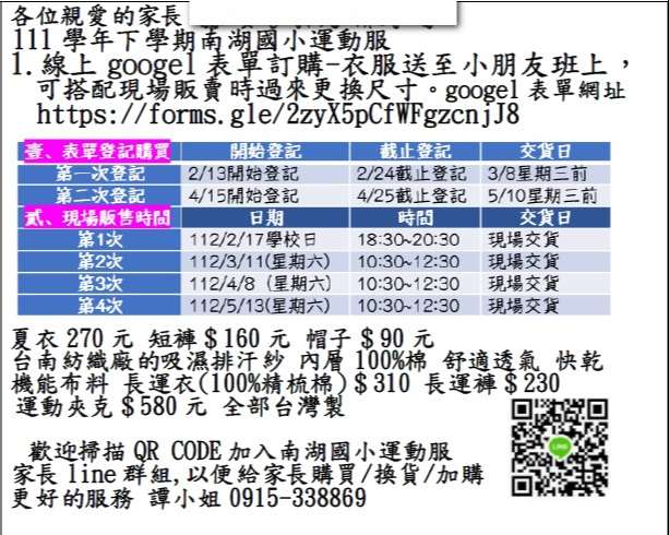六、家長收到運動服請仔細核對,若有缺件或項目不符, 可直接在南湖國小運動服家長line群組或直接