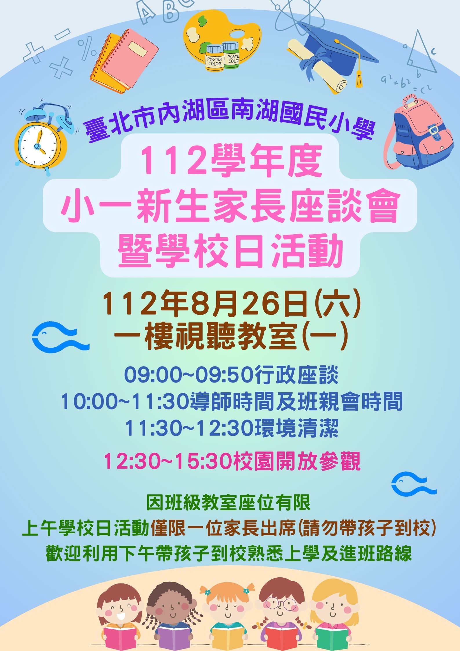 本校訂於112年8月26日(六)上午9時於一樓視聽(一)教室辦理小一新生家長說明會暨學校日活動,因教室座位有限,當日僅限1位家長出席(請勿帶孩子到校),感謝您的配合,歡迎踴躍參加。