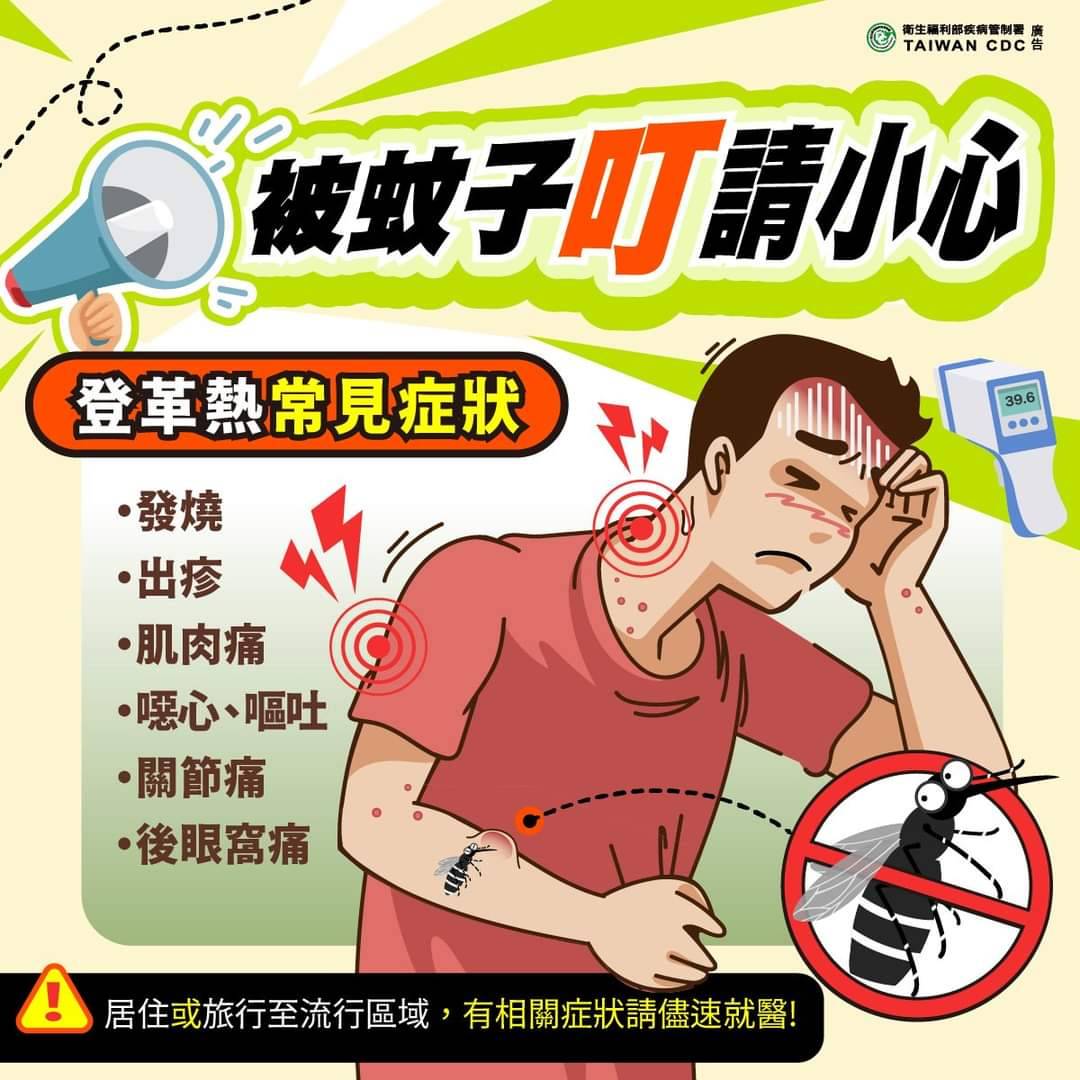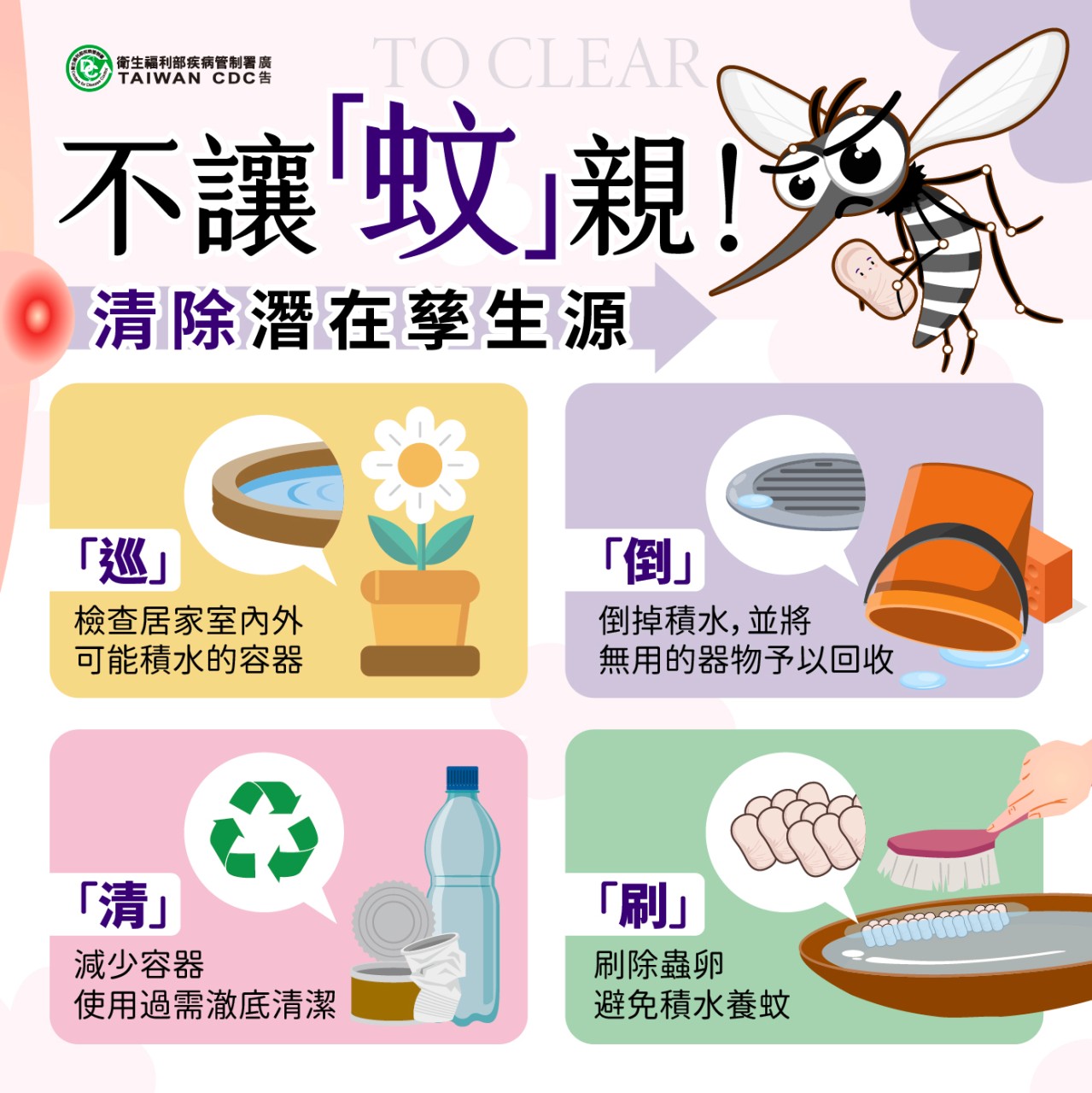 近期國內登革熱疫情嚴峻,敦請各位巿民落實「巡、倒、清、刷」,大家一起動手清除室內外積水容器,主動清除孳生源,以避免孳生病媒蚊,如出現發燒、頭痛、後眼窩痛、肌肉關節痛、出疹等登革熱疑似症狀,請儘速就醫,主動告知活動史及接觸史!