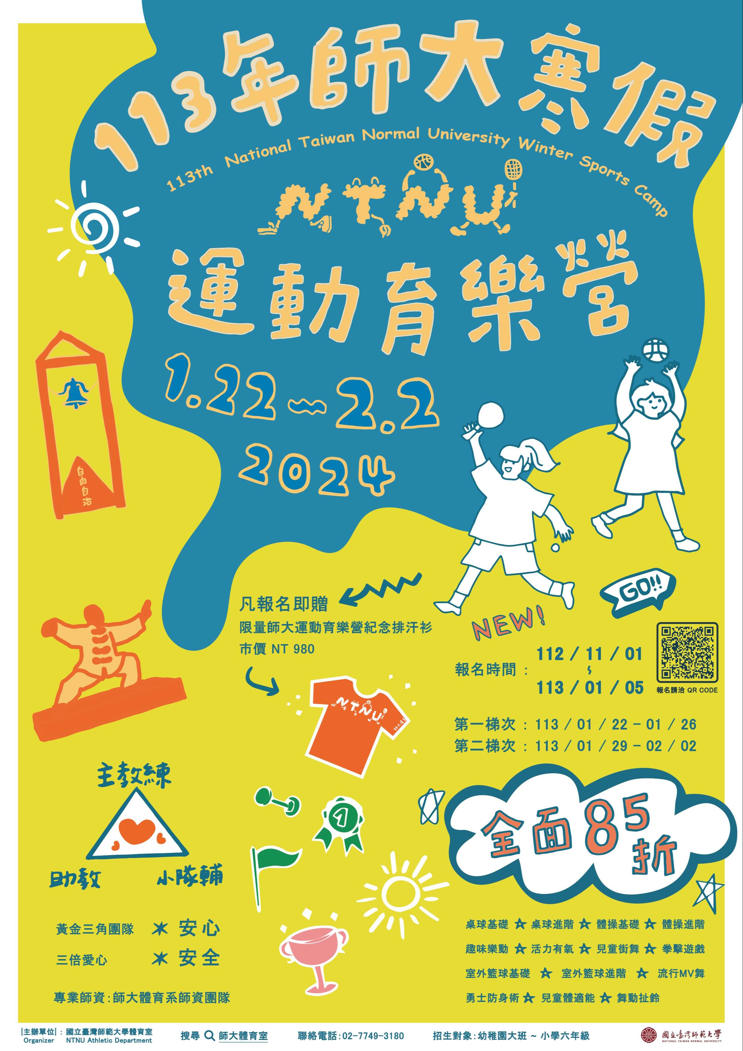 「113年師大寒假運動育樂營」共兩梯次,計有14種運動項目,共20個班別。招生對象為幼兒園大班至國民小學六年級。