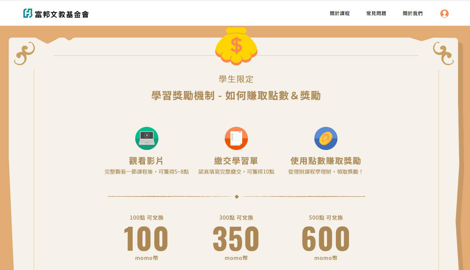 跟著可可從 「儲蓄」、「消費」、「收入」、「投資」、「永續」五大主題出發,一起了解金錢和我們的關係。課程分成三個階段,可依照自己的步調前進,初階適合7-9歲的學生,中階適合10歲以上的學生,高階適合12歲以上的學生。