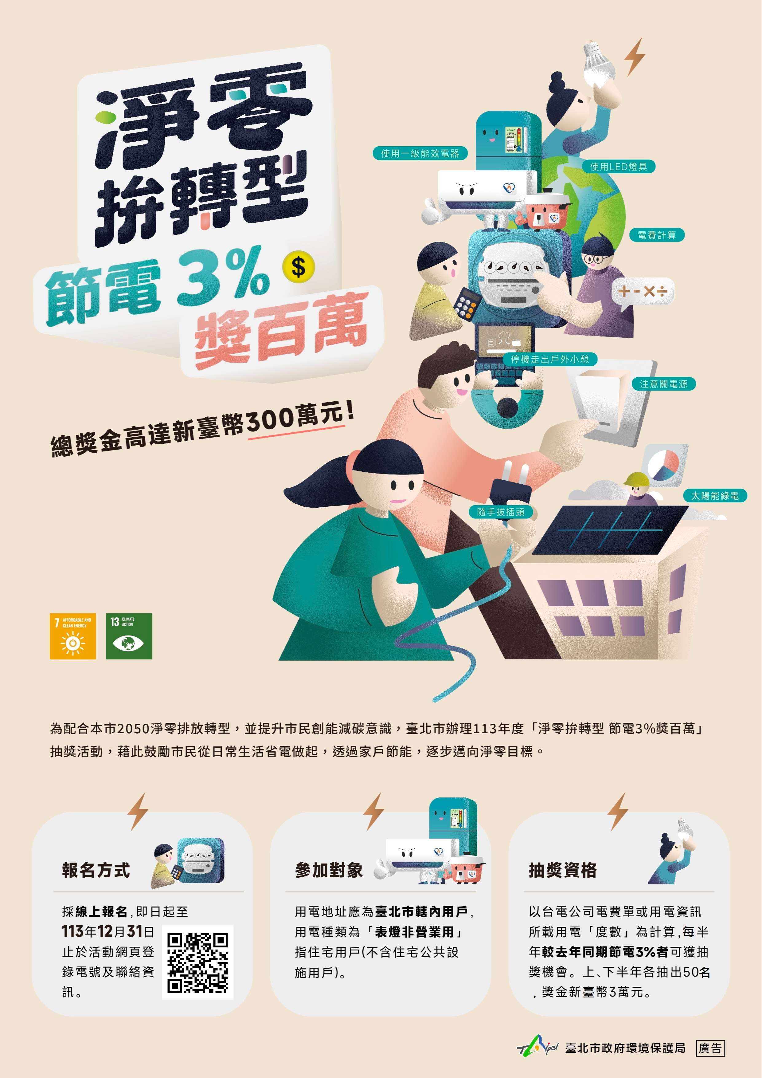 本府環境保護局為鼓勵市民落實節能減碳行動,即日起至 113年12月31日辦理「淨零拚轉型節電3%獎百萬」抽獎活 動,參加對象為臺北市轄內「住宅用戶」,每半年較去年同期節電達3%即可參加抽獎,113上下半年各抽出50名,每名獎金新臺幣3萬元。