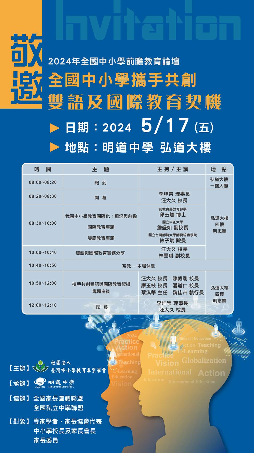 敬邀貴校校長、主任、家長會會長、副會長及家長委員參 加「2024攜手共創雙語與國際教育契機前瞻教育論壇」, 詳如說明,敬請覆核。