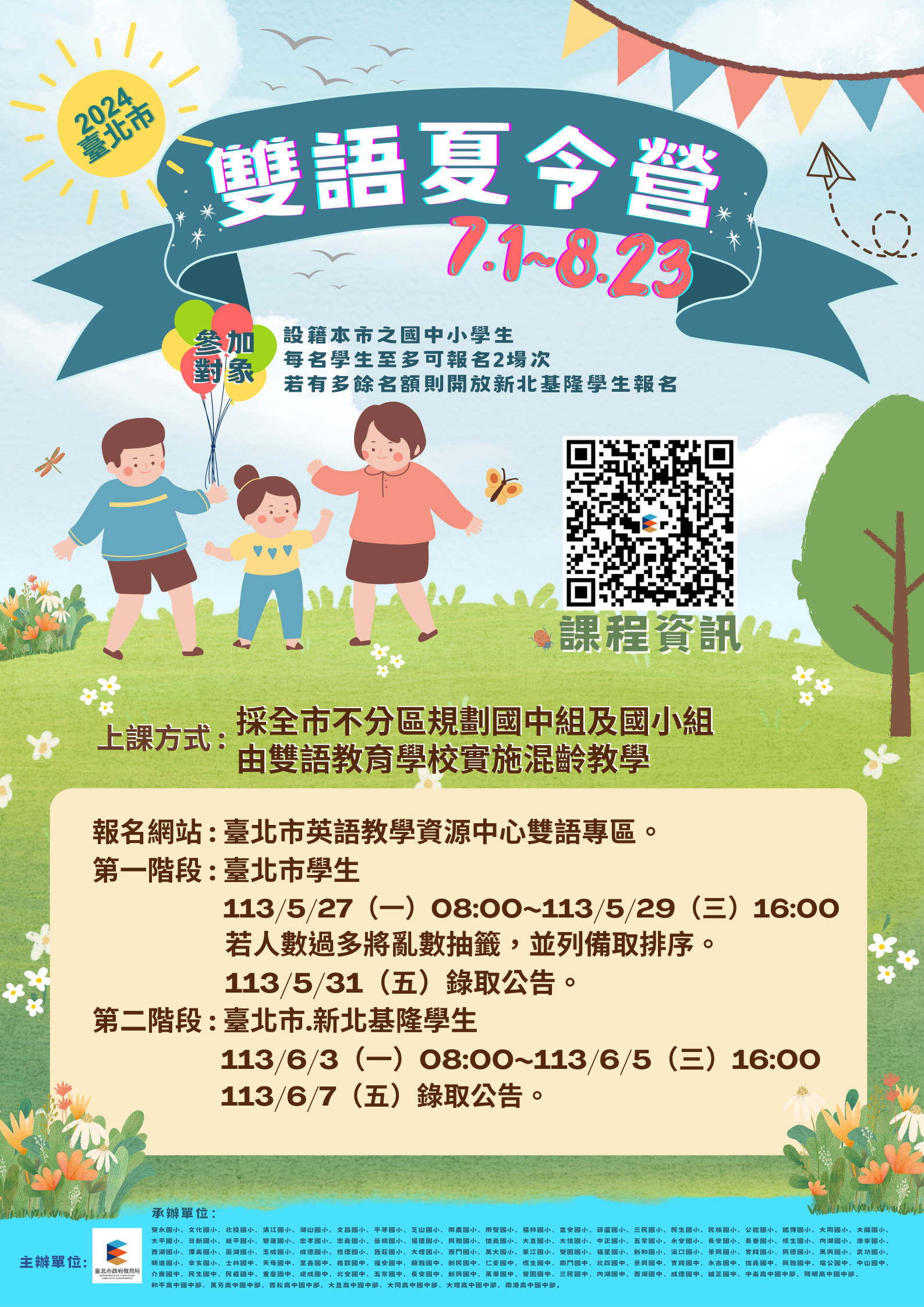 ★報名網址:臺北市英語教學資源中心雙語專區(https://ecamp.tp.edu.tw/bilingual/)開放網路線上報名。