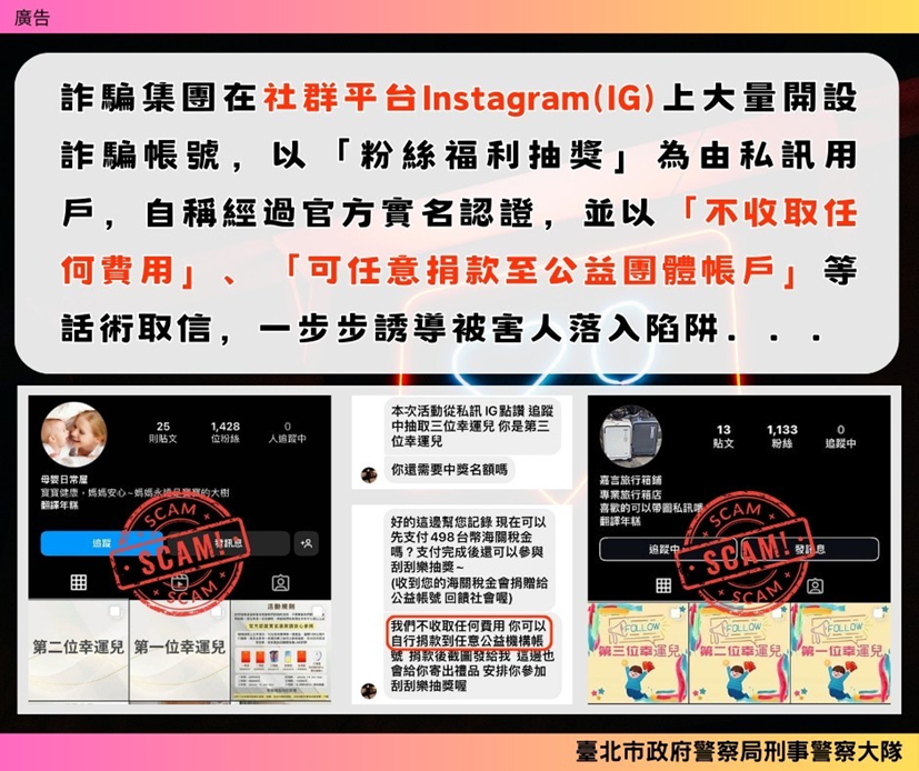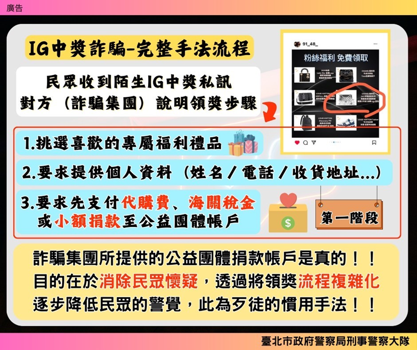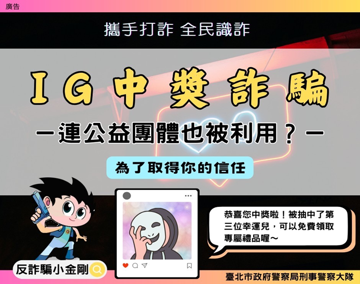 二、為賡續落實本市分齡分眾識詐宣導教育,本月以AI換臉詐騙、新型態IG中獎詐騙為宣導主軸,彙整反詐影片1部、圖片4張,以積極推動防詐宣導觀念。