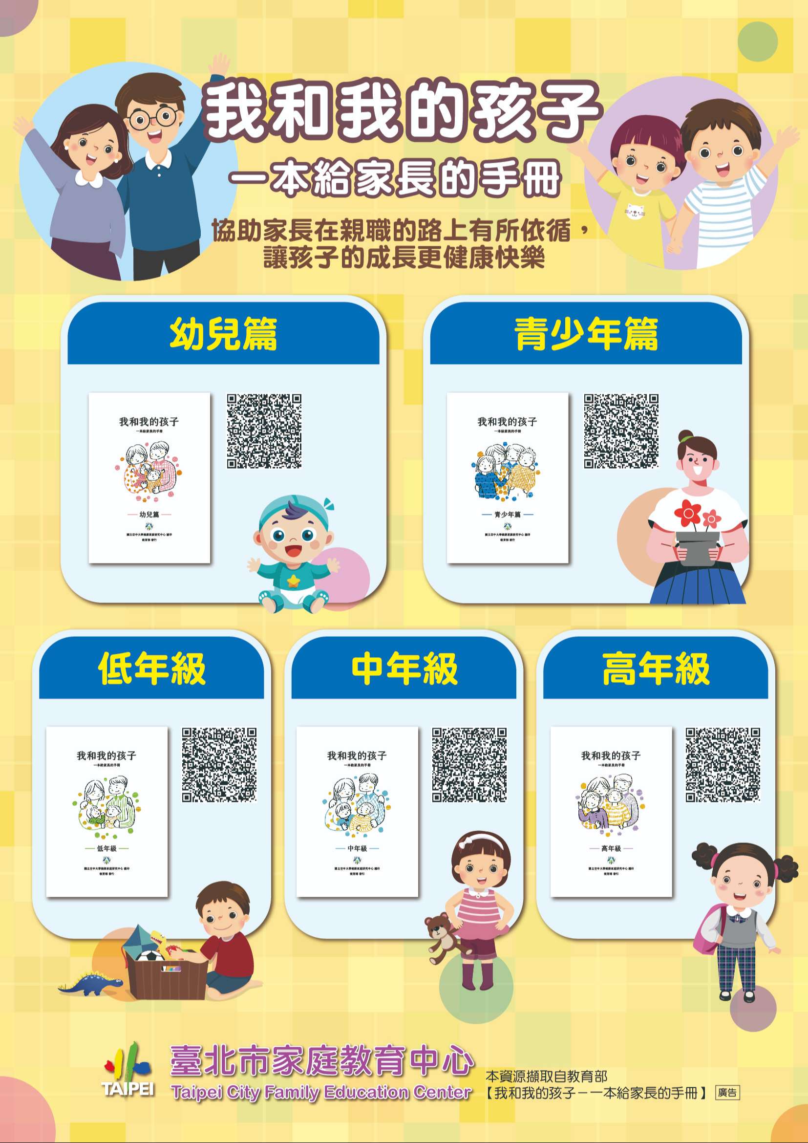 為陪伴家長與孩子共同經營學校及家庭生活,教育部邀集專家學者編製《我和我的孩子-一本給家長的手冊》 親職教育手冊(包含幼兒篇、國小篇及青少年篇),針對家有學前、國小及青少年階段孩子的家長,可能面對的親職課題,透過簡單易懂的條列式小提醒,協助家長輕鬆學習親職知能及技巧。
