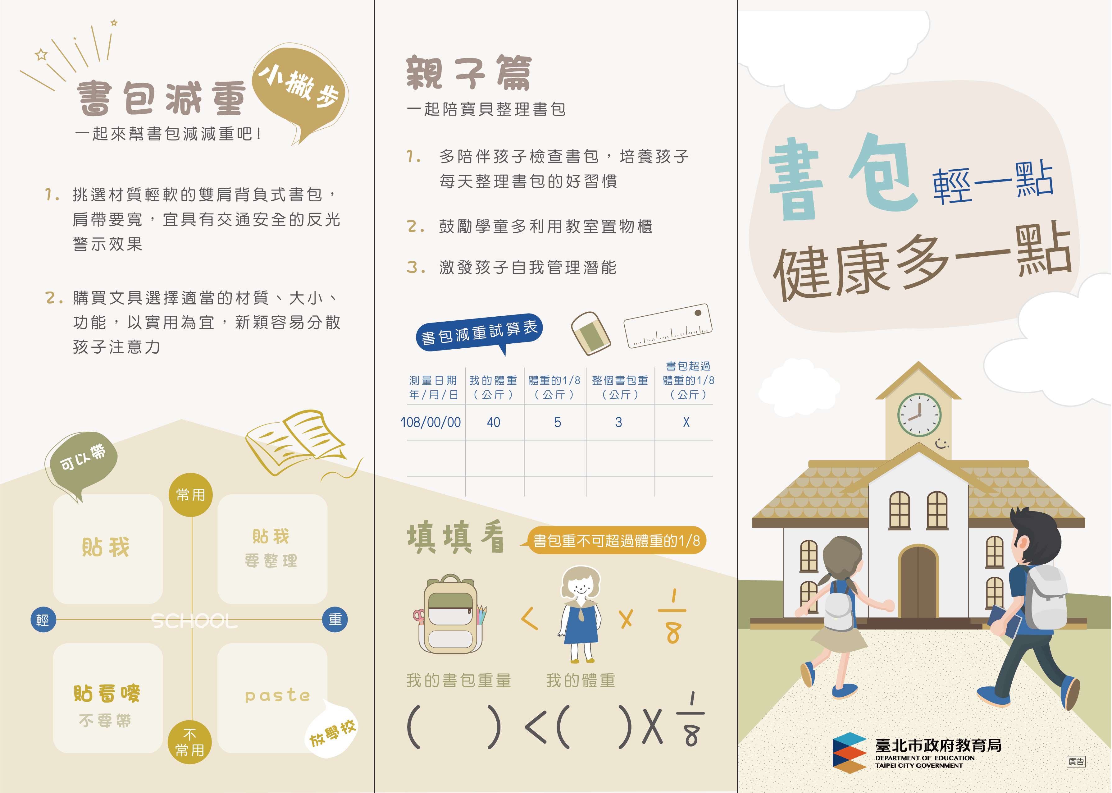 讓我們一起叮嚀孩子--當天作業的簿本、習作才裝入書包、文具減量、放學時將水壺的水喝光、選擇材質輕的文具用品、善加利用學校提供的置物空間收納物品、安親班(才藝班)教材及用品可手提......,減輕書包重量。
