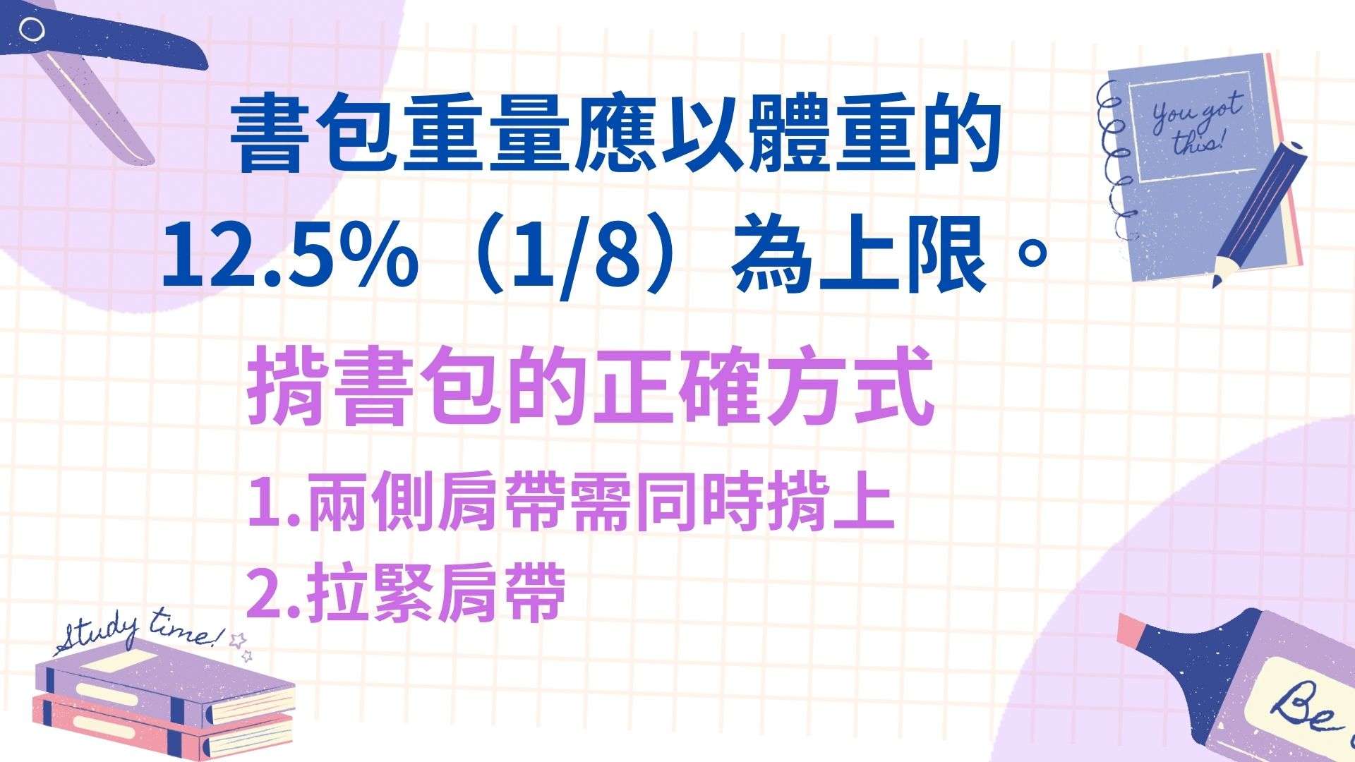 除此之外,身體左右對稱也很重要,所以建議採用雙肩背負書包,重量應接近骨盆,緊貼腰背,肩帶加寬以減少對上背肌肉的壓迫。