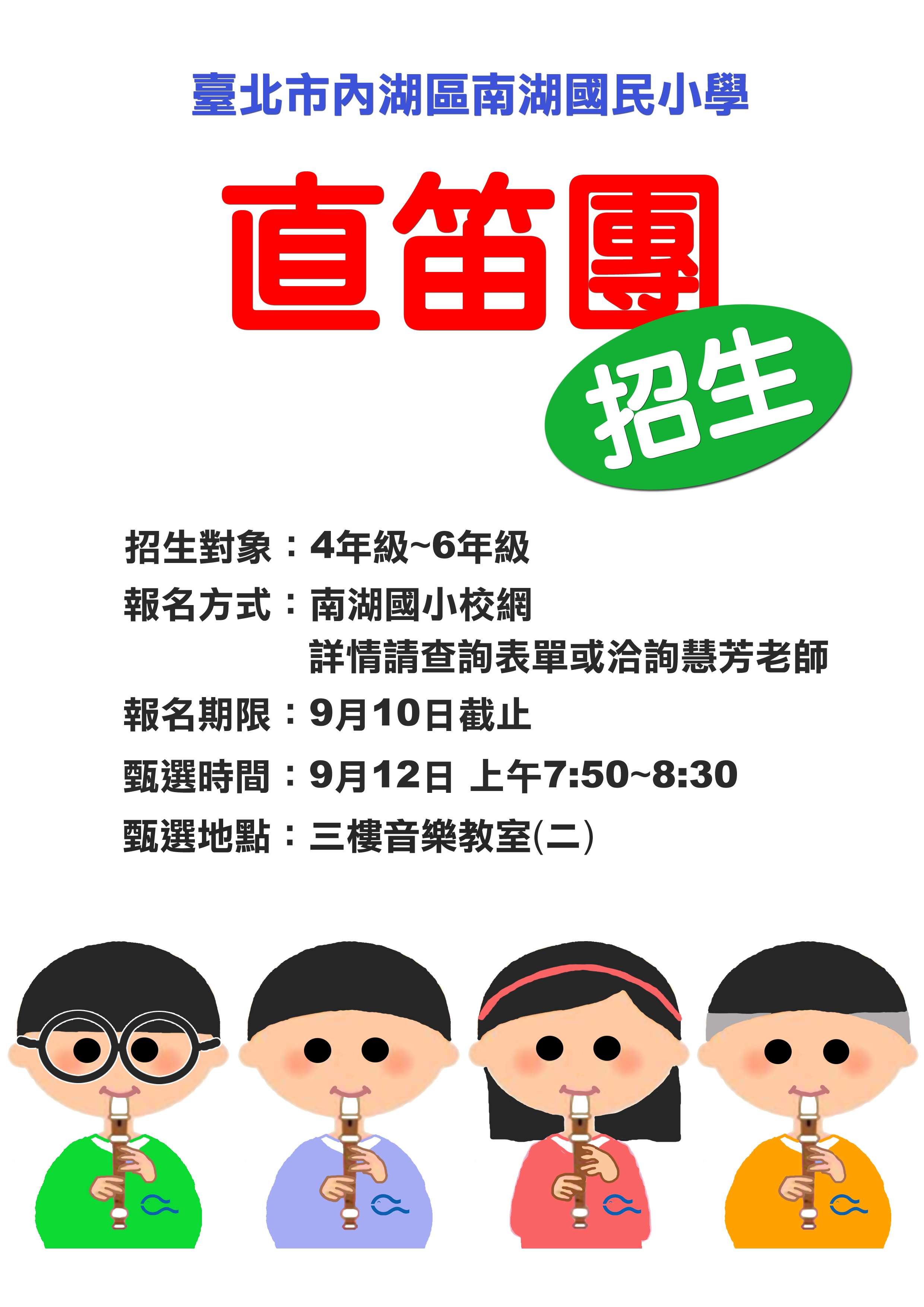 本校直笛團9/12(四)晨光時間於三樓音樂教室(二)對四到六年級學生進行招考,請四到六年級有興趣學生至https://forms.gle/VA4Bh2357wEHX4rRA 表單進行報名,並請記得向導師報告該時間要去直笛團甄選。