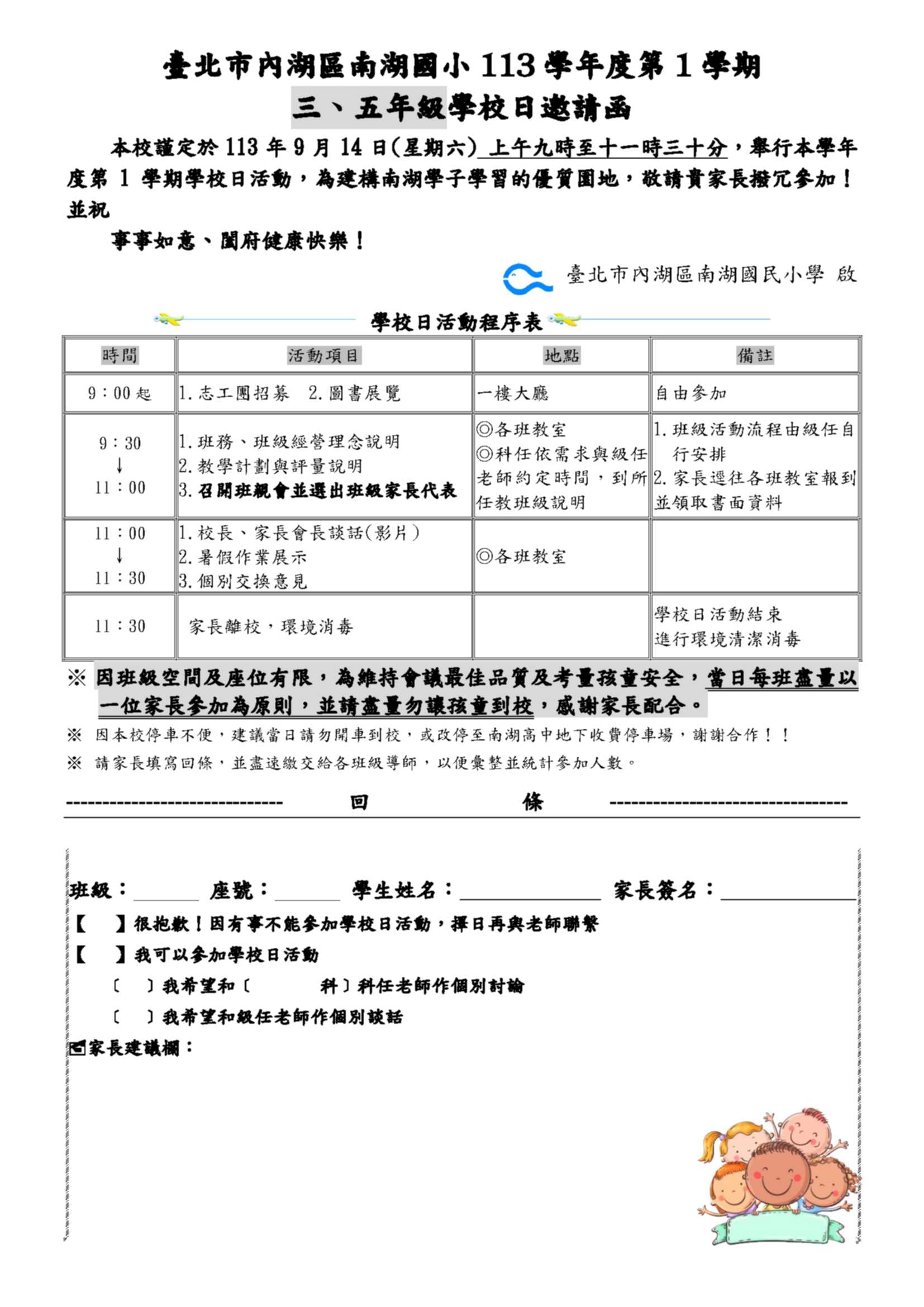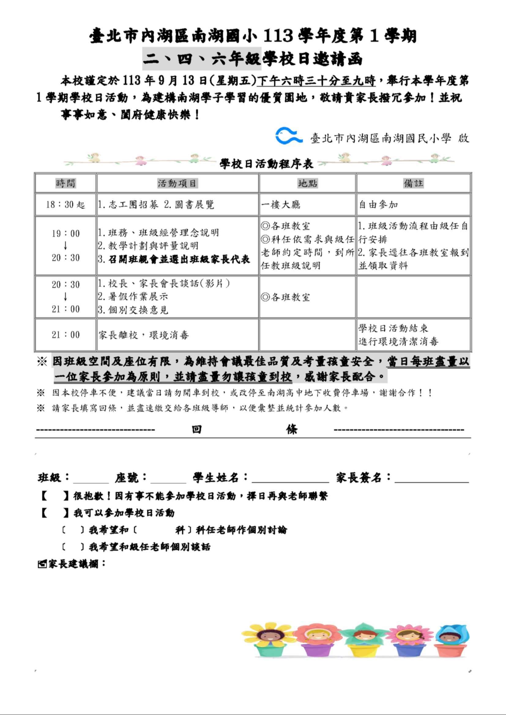 本學期二~六年級學校日訂於9/13、9/14舉行: