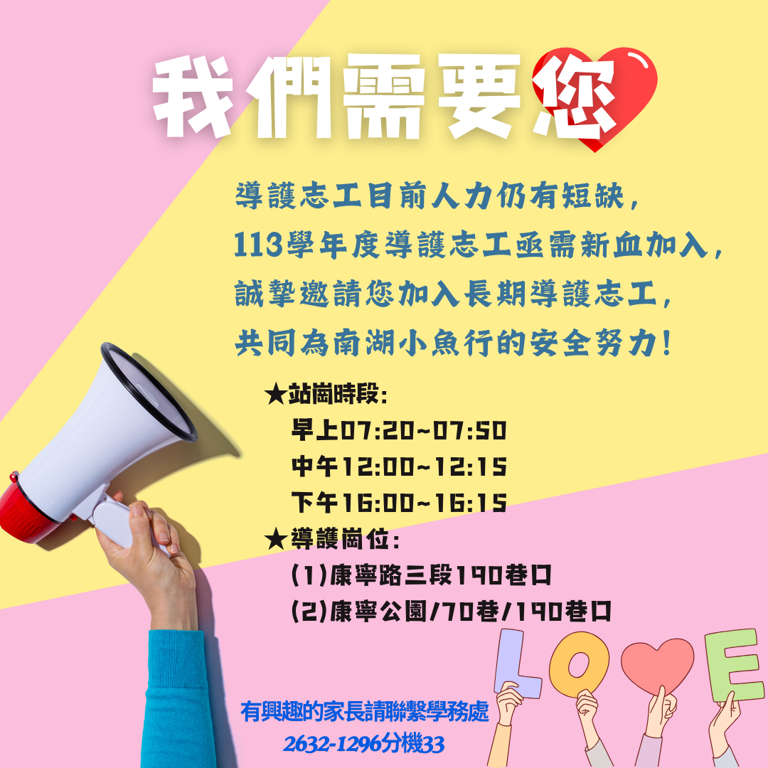 讓孩子平安的上下學,是我們共同的願望與責任。感謝過去熱心的長期導護志工家長,盡心盡力守護全校孩童的上放學安全,他/她們風雨無阻堅守崗位,沒有怨言的付出,令人感動。唯目前人力仍有短缺,113學年度導護志工亟需新血加入,誠摯邀請您加入長期導護志工,一同守護南湖小魚行的安全。