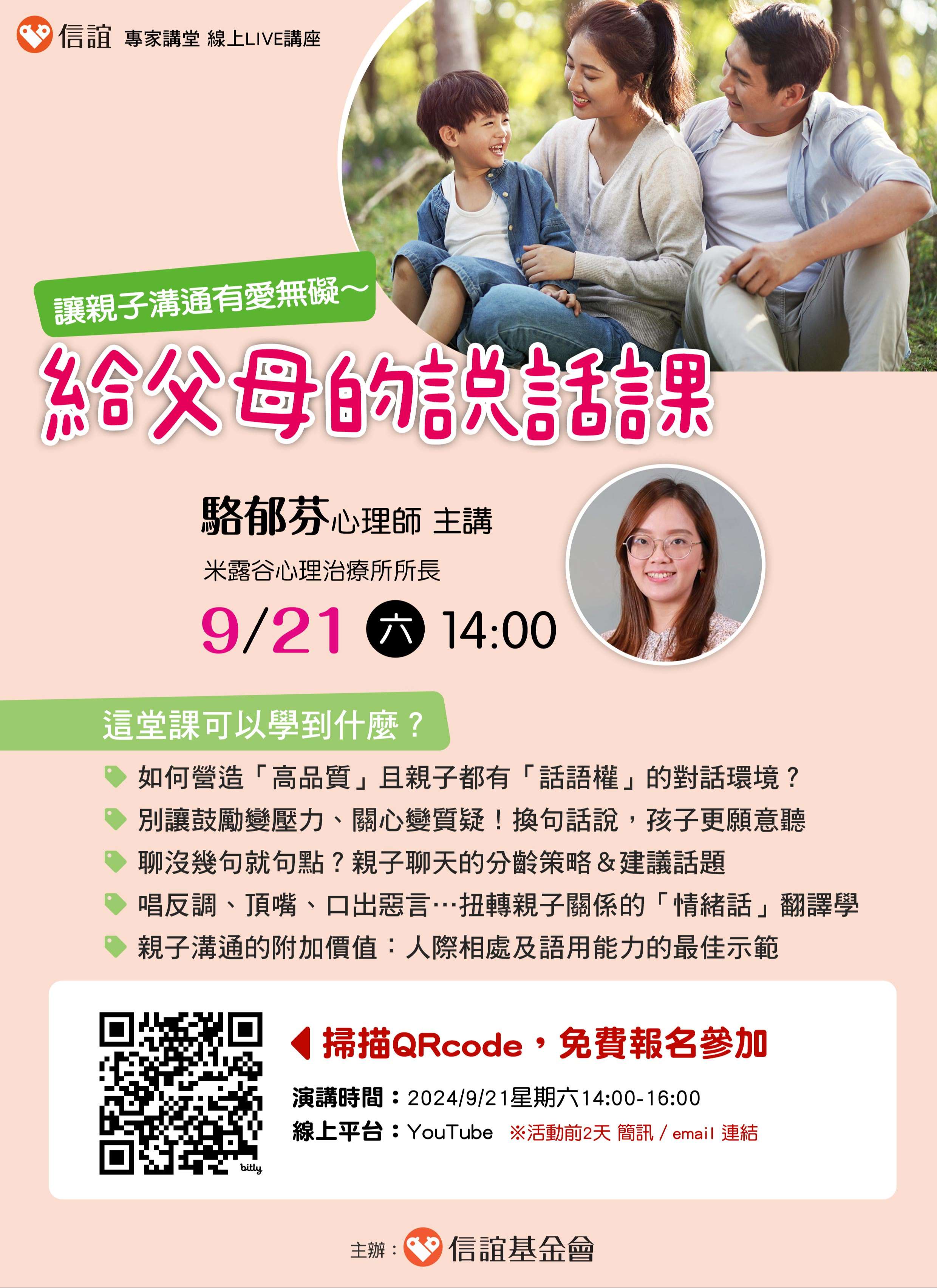 信誼基金會於9 / 21(六)舉辦【駱郁芬心理師主講/溝通有愛無礙~ 給父母的說話課】親職線上講座免費報名參加