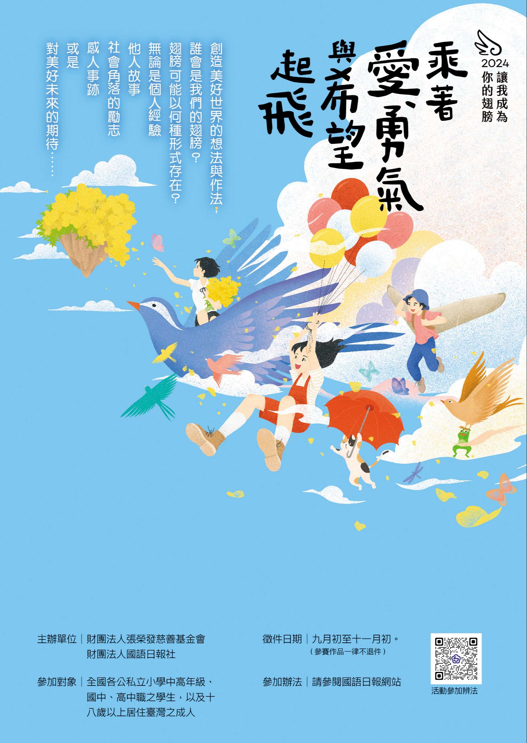 ★徵稿活動相關資訊及報名資料下載,請參見「2024讓我成為你的翅膀──乘著愛、勇氣與希望起飛」徵件活動網站(QR Code參見附件);或致電活動小組,電話(02)