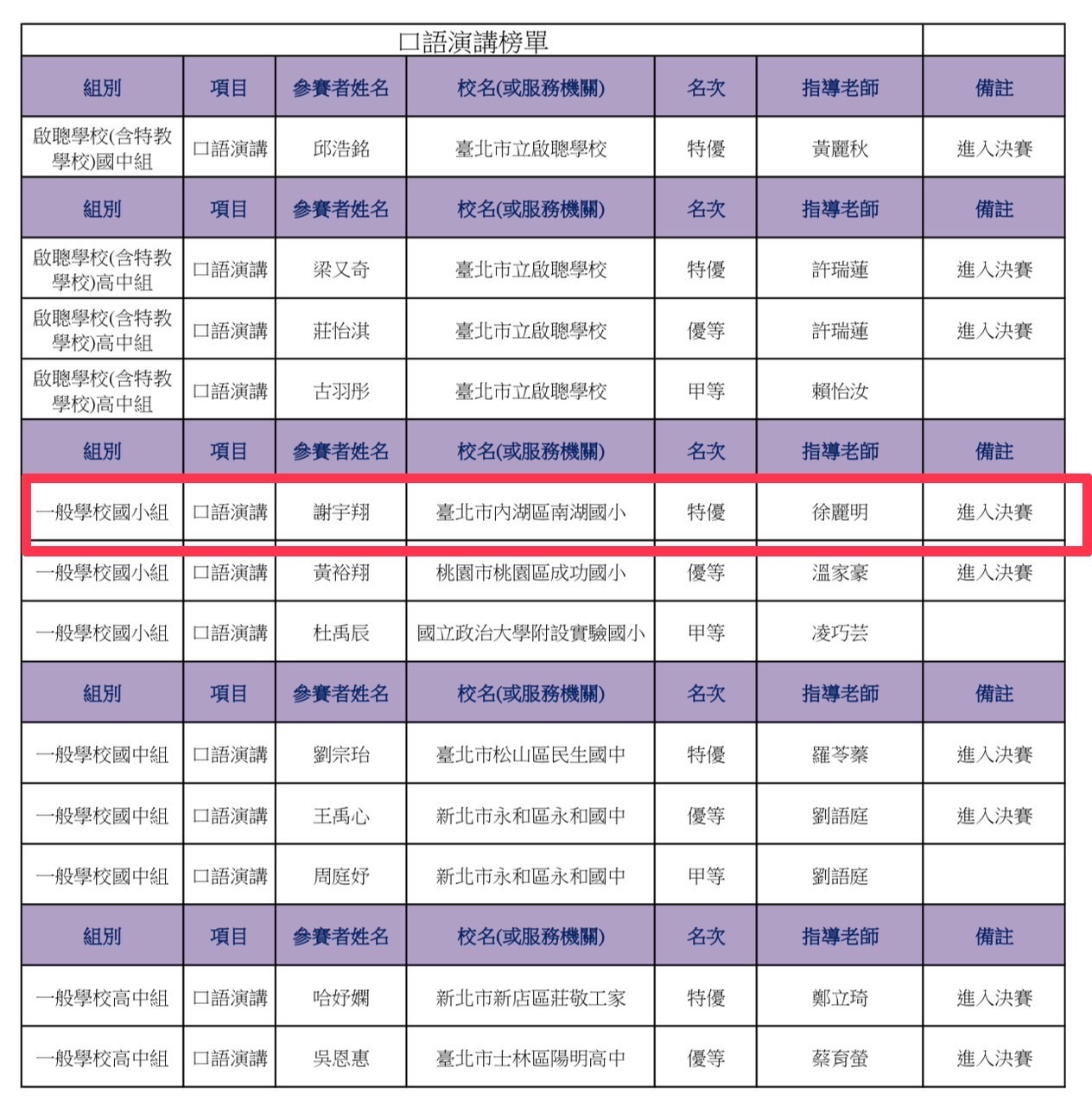 608謝宇翔榮獲口語演說國小組特優(第一名)