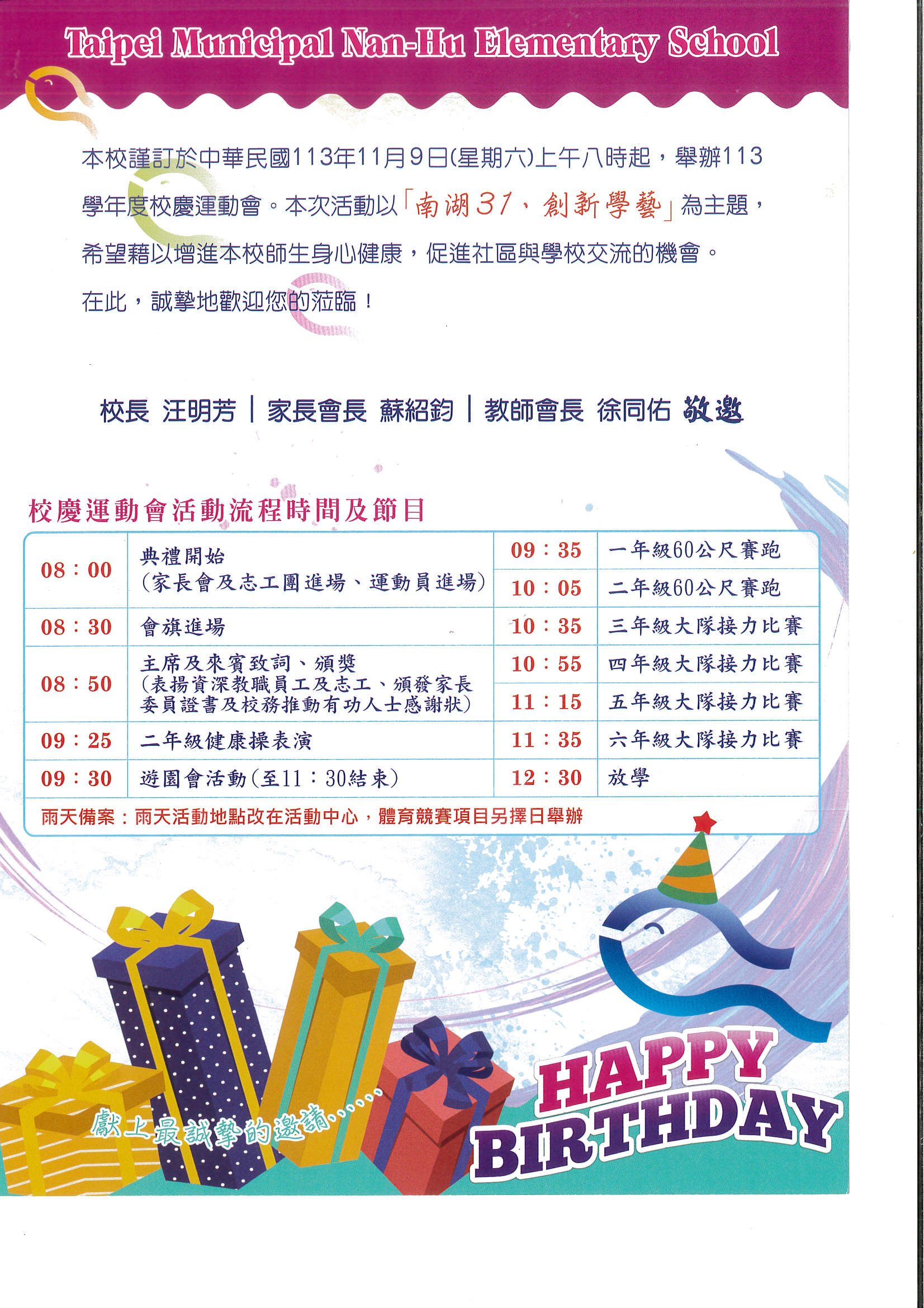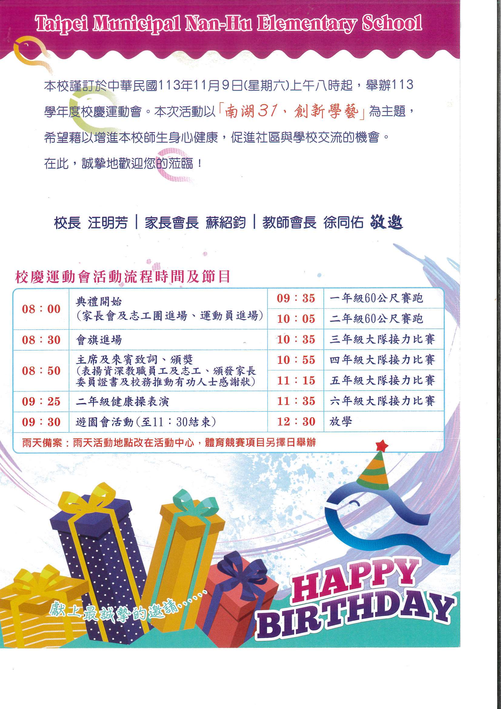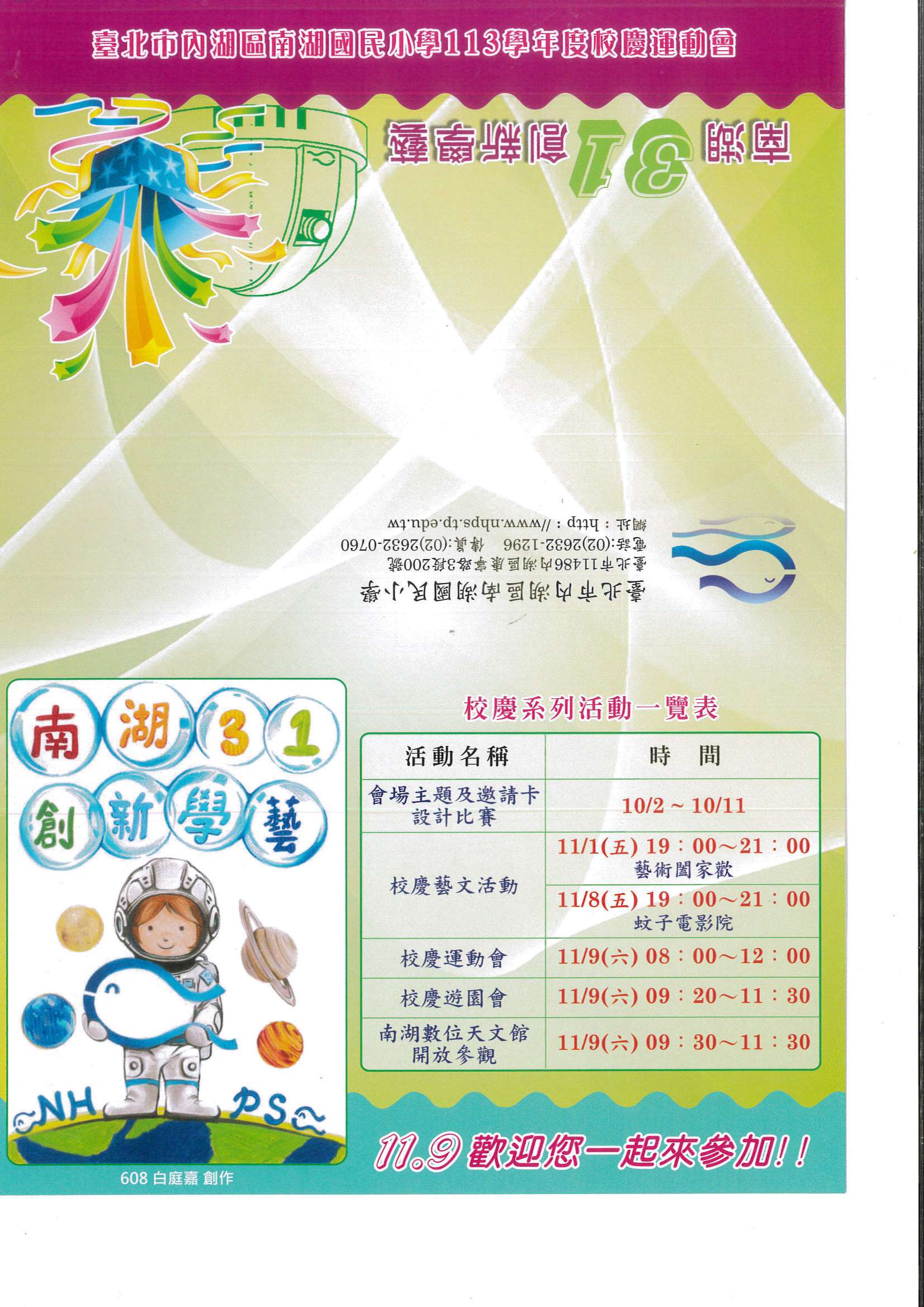 113年南湖國小校慶「南湖31、創新學藝」相關活動及注意事項:
