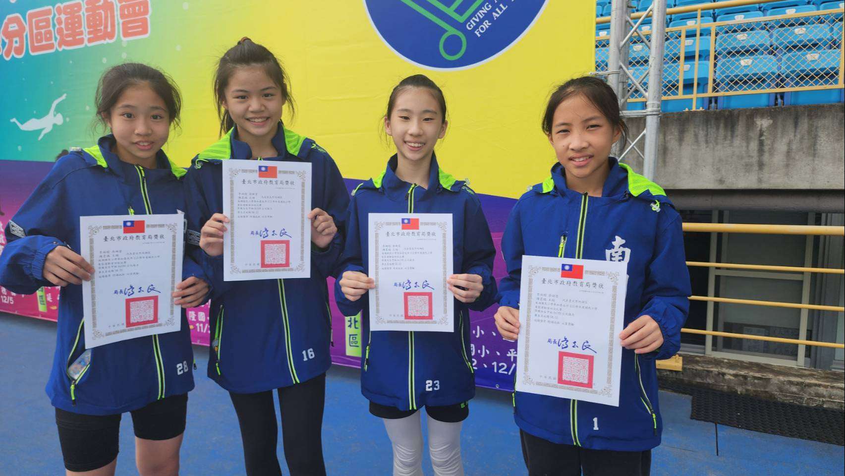 10.六年4班李雨橙、吳映萱、陳柔瑀、王頎榮獲女生甲組4X200公尺接力第六名,成績2分06秒59