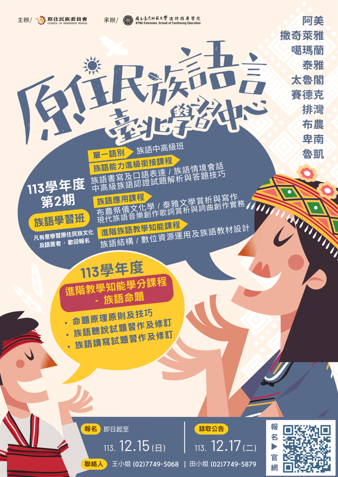 ◎招生對象:有意學習阿美族、噶瑪蘭族、撒奇萊雅族、泰雅族、太魯閣族、賽德克族、排灣族、布農族、卑南族、魯凱族等族語