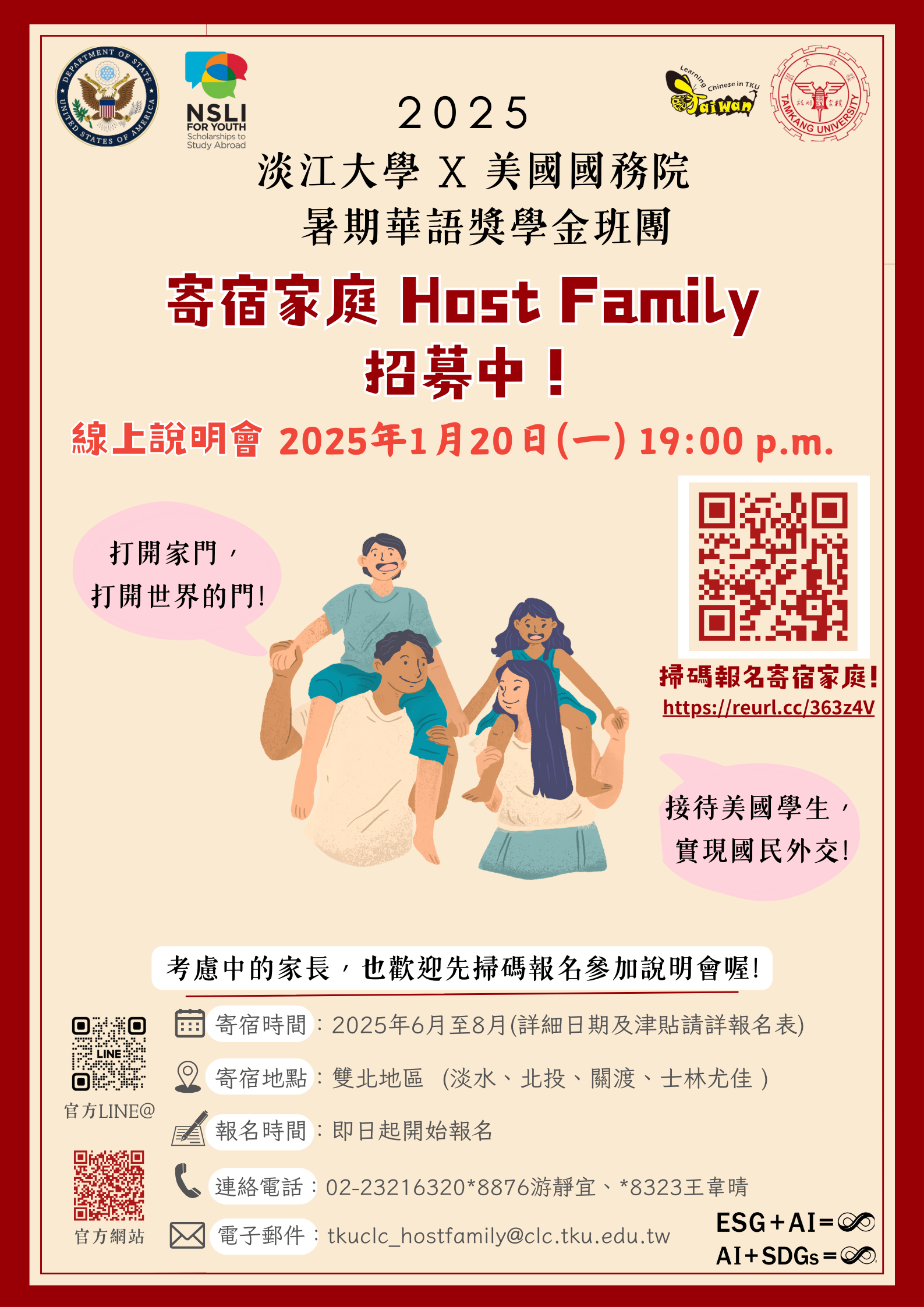 五、寄宿家庭及線上說明會(114年1月20日晚上7時)報名網 址:https://reurl.cc/363z4V,考慮中的家庭可先聆聽線 上說明會再決定是否報名;有意願提供寄宿空間之家庭需先行至報名網址填寫資料,承辦人員將審核家庭資料並安 排實地走訪接待住宿地點,再另行通知錄取及備取名單。