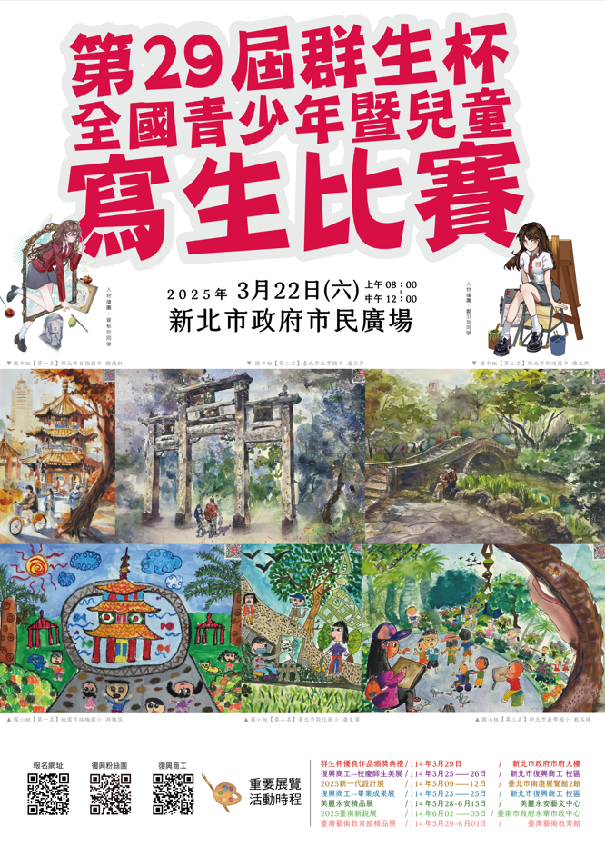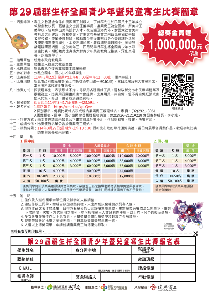 五、線上報名網址: https://reurl.cc/xpLQve (即日起至114年3月17日(一)23:59止)六、比賽簡章公告於群生基金會網站首頁 http://ischool.fhvs.ntpc.edu.tw/ischool/publish_page/193/,敬請下載查閱。