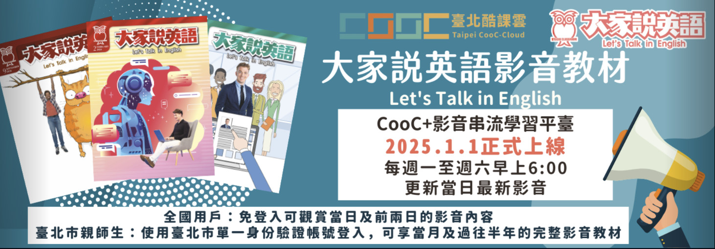 為提供本市親師生多元英語學習資源,臺北酷課雲自114年1月起,於「CooC+影音串流學習平臺」新增「大家說英語」授權影音教材。