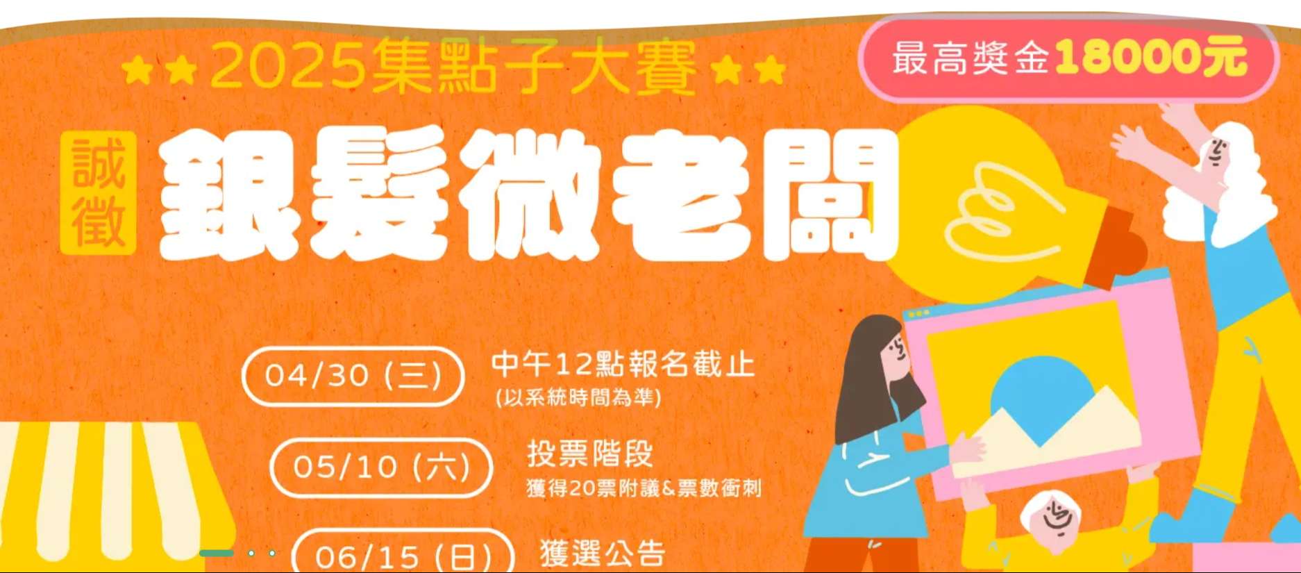 一、本會舉辦「2025集點子大賽」,鼓勵全民共同參與,希望藉助大眾無窮 的創意巧思,一同打造幸福高齡生活。參加者只要針對高齡議題有想法, 以300個字寫出構想,幫助銀髮族群活出健康、活力及夢想;今年徵件 設有「開放組」與「主題組」兩個組別,透過主題組主題「銀髮微老闆」 更聚焦,也針對65歲以上長輩提案設計「銀創獎」,讓點子再進化,獲 選點子也將成為下半年「共好行動徵選」提案單位的參考構想,讓好點 子有機會被實踐,期望藉此激發更多元創新的高齡服務方案。