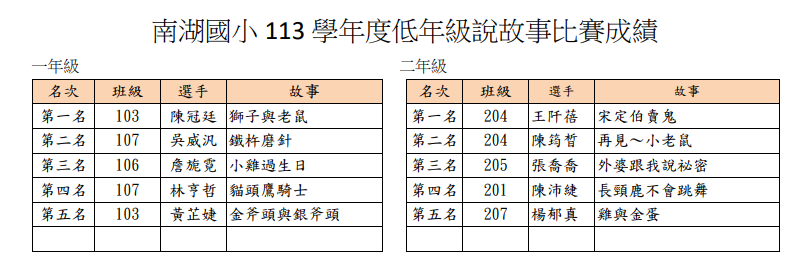 113學年度南湖國小--低年級說故事比賽得獎名單,如附件!