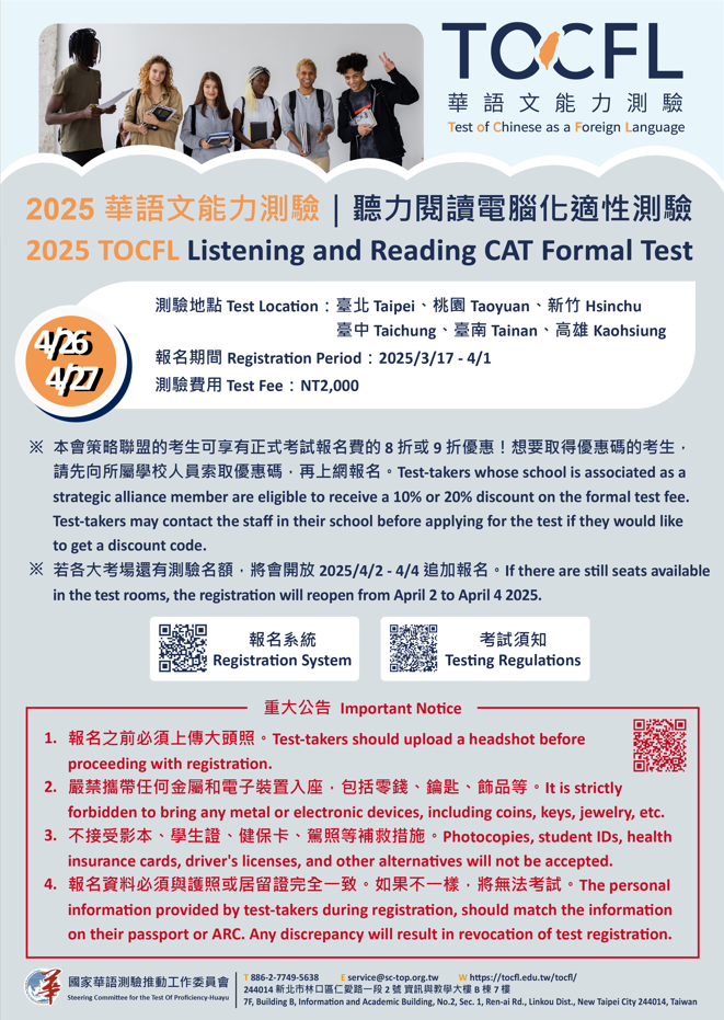2、測驗日期:4月26至4月27日(星期六、星期日)聽讀測驗-電腦化適性測驗。