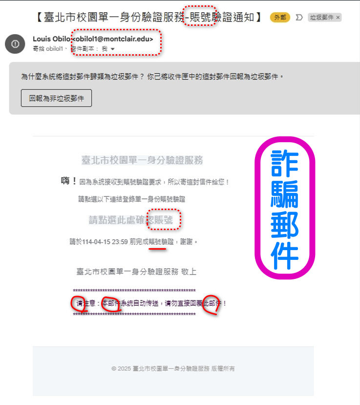 近期詐騙信件橫行,惡爪已經延伸到教育界,若您有收到郵件標題是「臺北市校園單一身分驗證服務-帳號驗證通知」,實為駭客竊取使用者帳號密碼之手段。