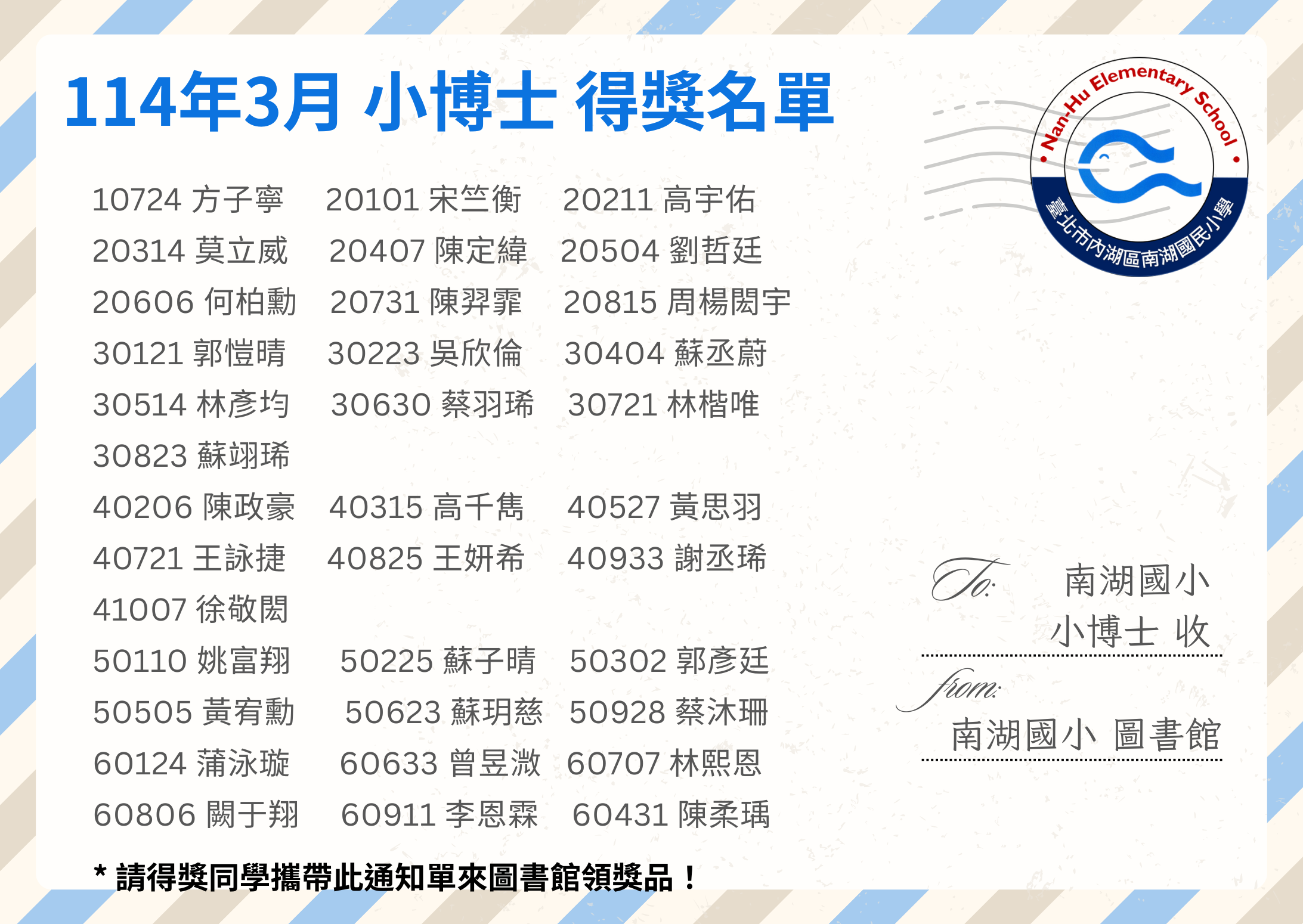 *原50223金荷娜上回有得獎,採輪替原則重抽更正為同班50225蘇子晴同學領取,