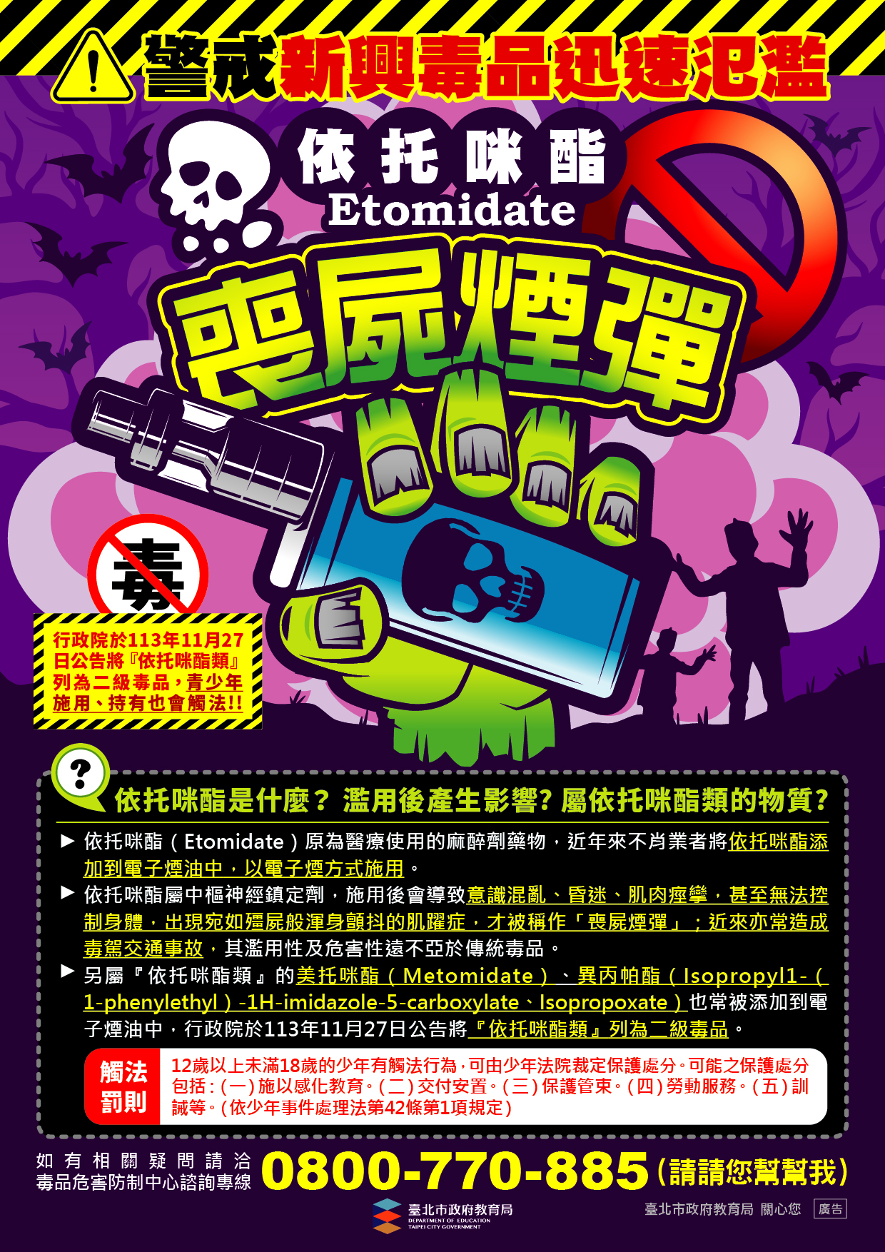 隨著新興毒品氾濫,依托咪酯(Etomidate)以其易於偽裝的特性,逐漸成為學生群體中的危險物質,甚至有不肖業者將其加進電子煙油中,以電子煙方式施用;依托咪酯屬中樞神經鎮定劑,施用後會導致意識混亂、昏迷、肌肉痙攣,甚至無法控制身體,出現宛如殭屍般渾身顫抖的肌躍症,才被稱作「喪屍煙彈」,近來亦常造成毒駕交通事故,其濫用性及危害性遠不亞於傳統毒品,影響校園安全甚鉅,行政院於113年11月27日將其列為二級毒品,為了讓學生遠離毒害,教育局推出針對依托咪酯類毒品的宣導電子海報(EDM)向教師家長、學生提醒此毒品之危害及相關罰則,以增強毒品防範意識。