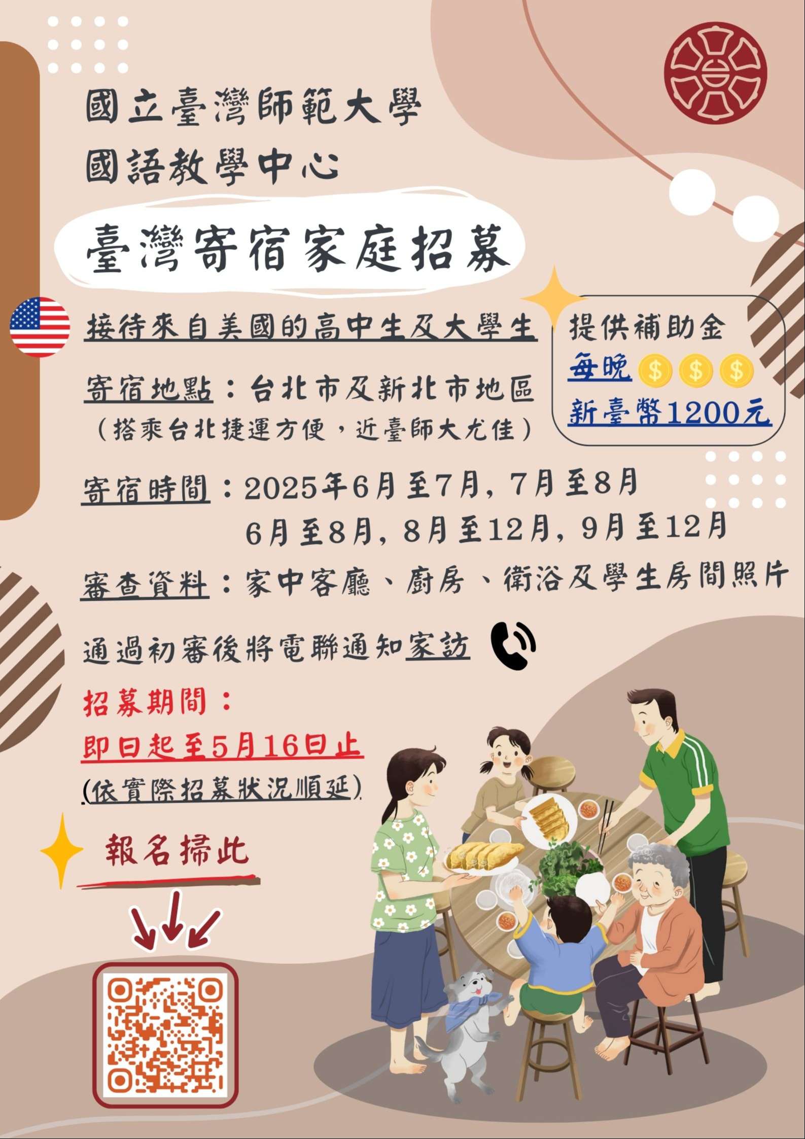 國立臺灣師範大學國語教學中心為辦理「114年國際教育交流協會CIEE美國高中生及大學生短期華語文研習團計畫」,需徵選臺灣寄宿家庭,敬請惠予公告並鼓勵師長及家長們踴躍報名。