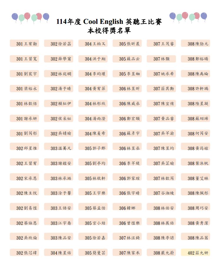 🎉賀!本校學生參加 Cool English 英聽王比賽,共173人獲獎!