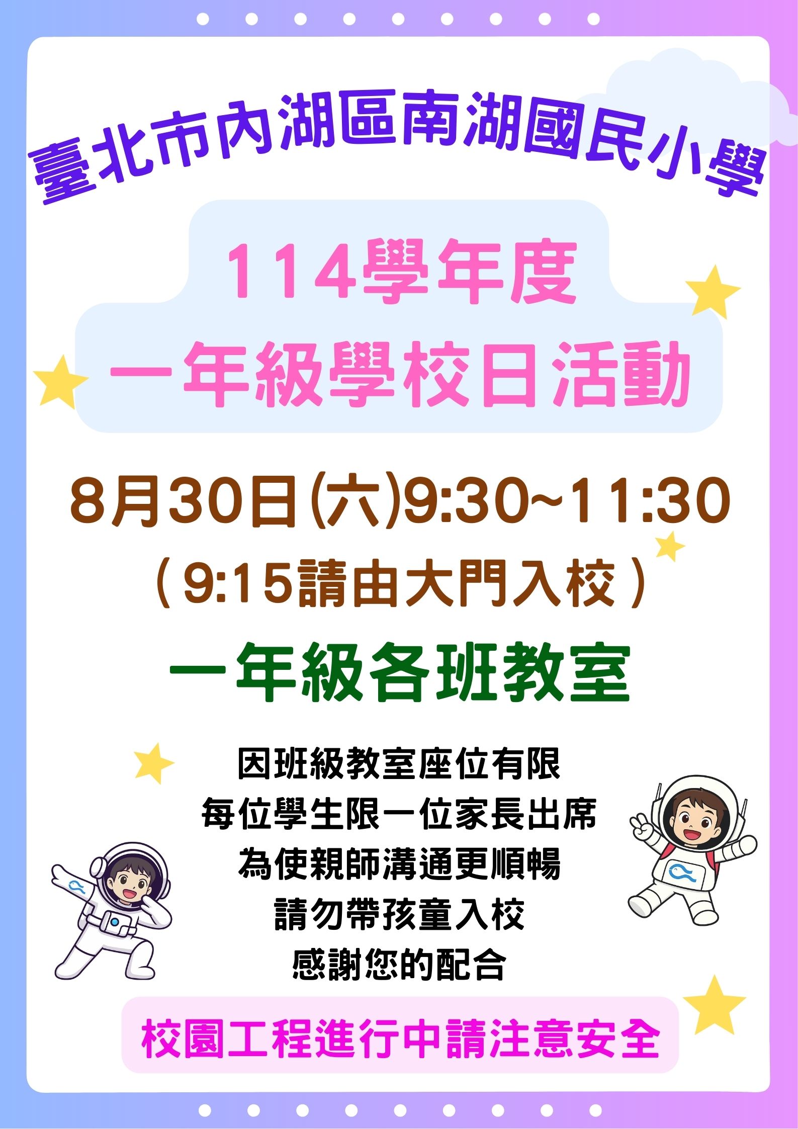 👉一年級學校日:8/30(六)9:30-11:30(9:15請由大門入校),親師溝通及班親會時間,因教室內座位有限,每位學生限一位家長代表出席。為使親師溝通更順暢,請勿帶孩童入校,感謝您的配合!