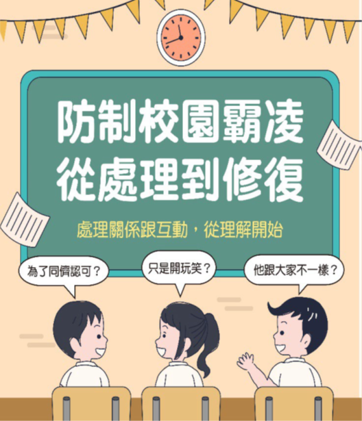 在生對生霸凌事件的調查程序新增「調和制度」,將「輔導先行」概念納入處理過程,旨在透過更具教育意涵的機制,營造尊重、關懷、安全與健康的學習環境。114學年度友善校園週以「停!聽!看!一起『調』出『和』諧的友善校園!」為主題,透過「停!聽!看!」具體行動,深化對校園霸凌防制及友善人際互動的認知,強化對求助的意識與能力。