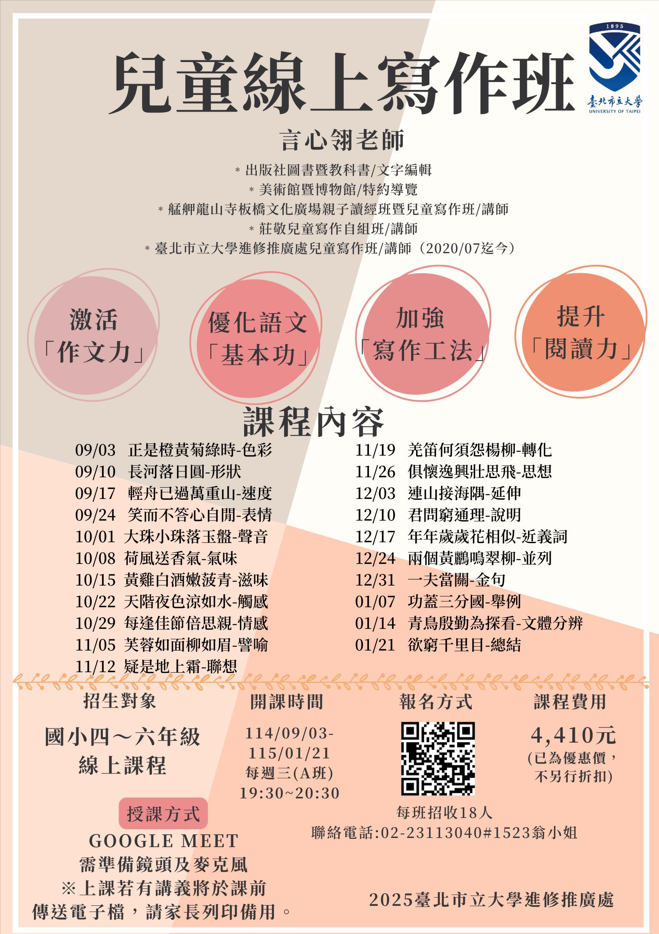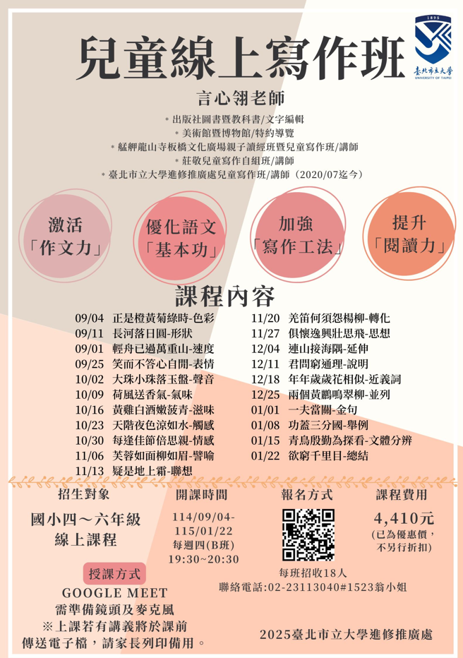 六、檢附課程招生海報1份,如有課程相關疑問,請逕洽本案承辦人翁小姐(02-23113040轉分機1523)。
