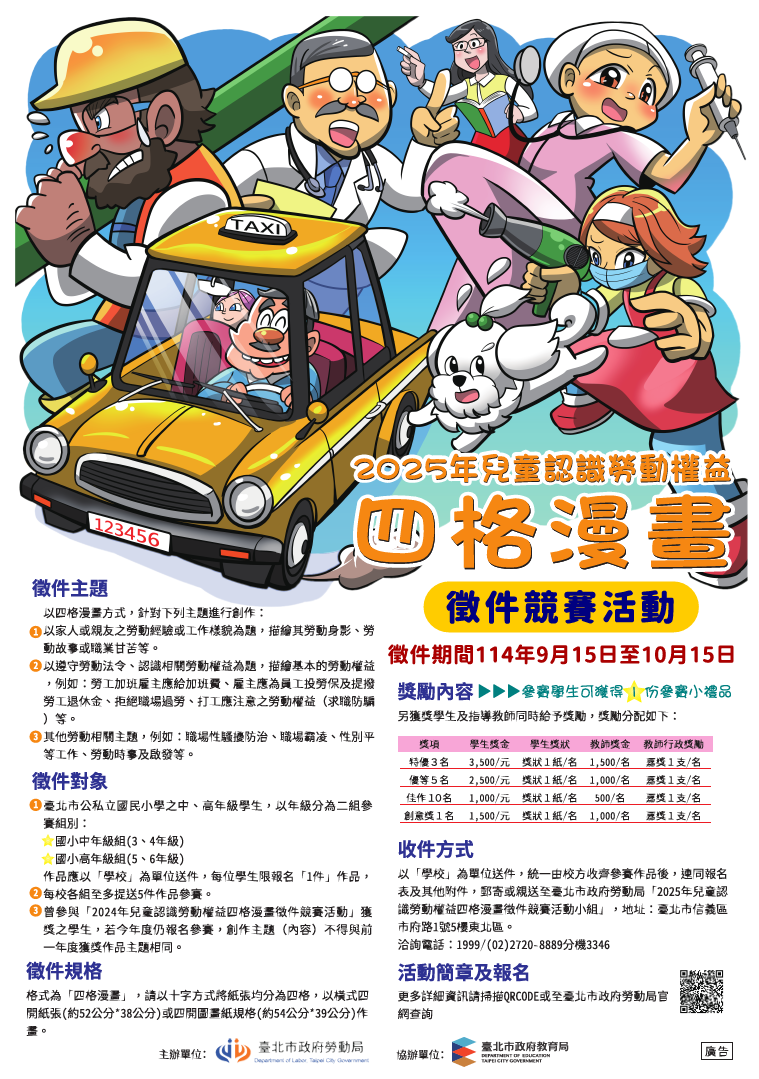 4、曾參與「2024年兒童認識勞動權益四格漫畫徵件競賽活動」獲獎之學生,若今年度仍報名參賽,創作主題不得與前一年度獲獎作品主題(內容)相同。