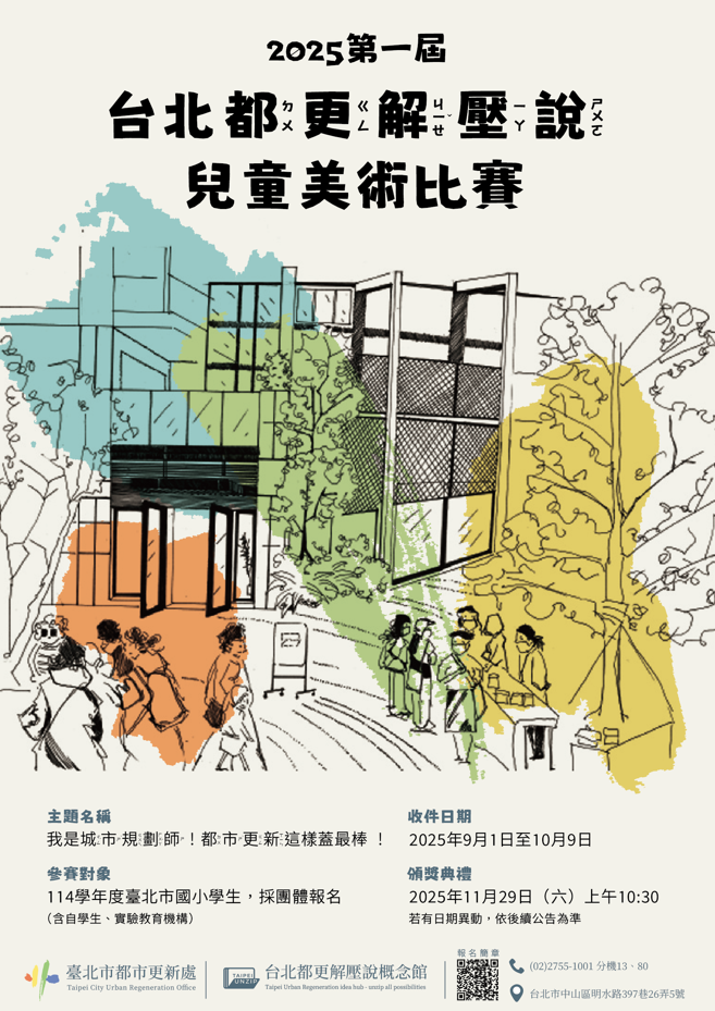 我們誠摯邀請所有臺北市熱愛畫畫的小朋友,參加「2025第一屆台北都更解壓說兒童美術比賽」─以「我是城市規劃師!都市更新這樣蓋最棒!」為題,畫出你心目中最棒、最適合大家一起生活的城市樣貌!一起發揮想像力,利用畫筆揮灑、規劃出一個結合日常生活與實用性的創意城市,將想像中的城市創造於畫紙上吧!未來的城市有你的參與更美好!