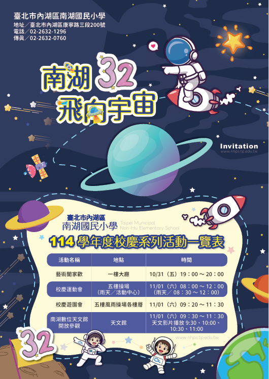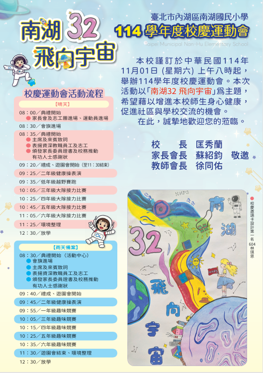 114年11月1日(星期六)為本校校慶體表會,竭誠歡迎大家前來共襄盛舉,以下為學生創作圖案製成的邀請卡