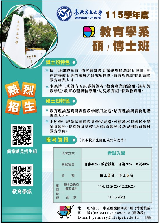 四、面試時間:115年3月7日(星期六)。 五、詳細招生資訊請參閱附件招生海報,或逕至本校招生網站 查詢。