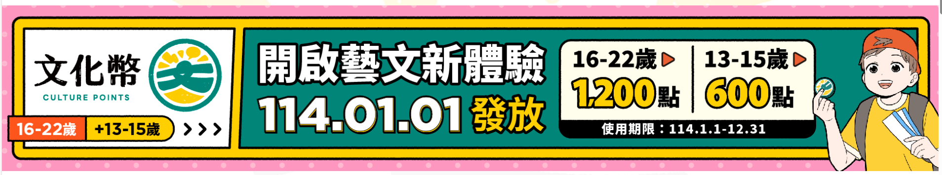 2.114年度13-15歲每人發放600點文化幣(1點等同新臺幣1元)試辦計畫,培養青少年藝文消費習慣。相關活動可參閱附檔之文化幣懶人包。
