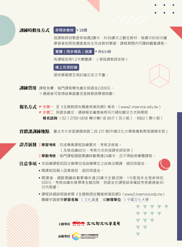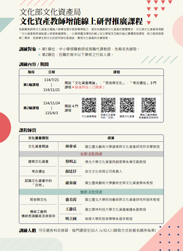 一、為鼓勵教師將文化資產主題融入教學並提升教師專業能力,提供在職教師文化資產的整體概念,文化部文化資產局規劃「文化資產教師增能線上研習推廣課程」,以兼具靈活彈性的線上自主學習及互動討論之實體面授課程,助力教師發展第二專長,促進學生對文化的認同與社區連結,實現文化資產的永續發展。