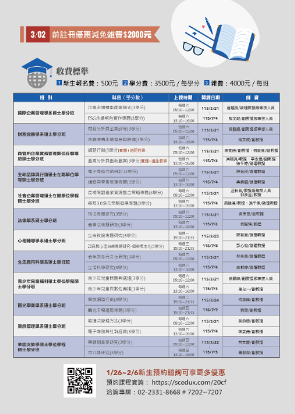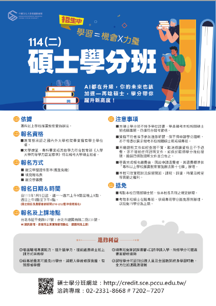 三、本校114學年度第2學期碩士學分班招生所別共計12班,詳情請參閱附件檔案。【新生首次報名可享更多優惠】
