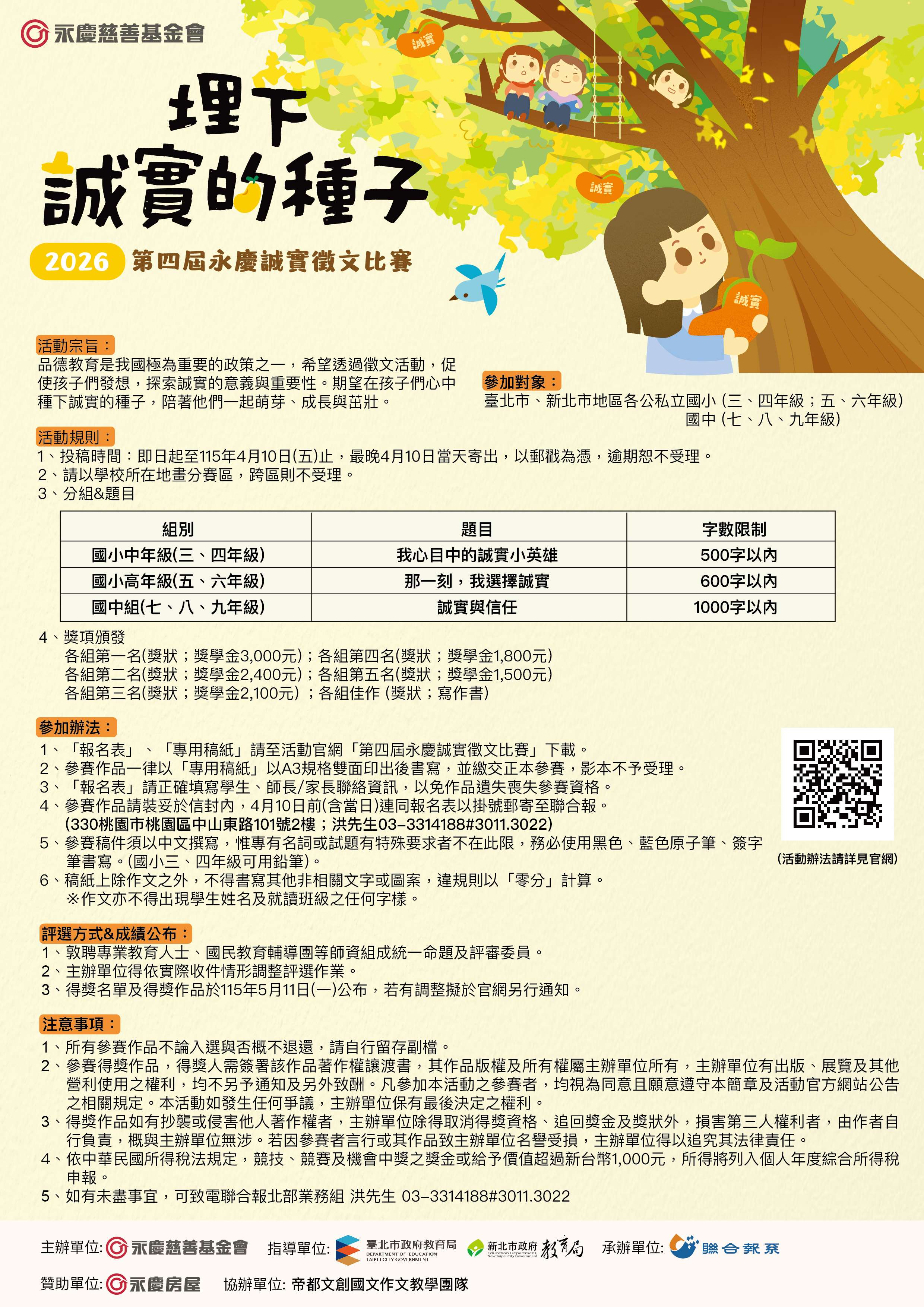二、旨案乃為透過徵文活動,培養學生對於生活的觀察力,並從寫作中探索自我價值與思潮,讓品格教育的觀念向下扎根,以「埋下誠實的種子」為主題,希望學生從將品格素養融入文字的過程中,亦將優良德行落實於日常生活、徵文活動內容摘要如下: