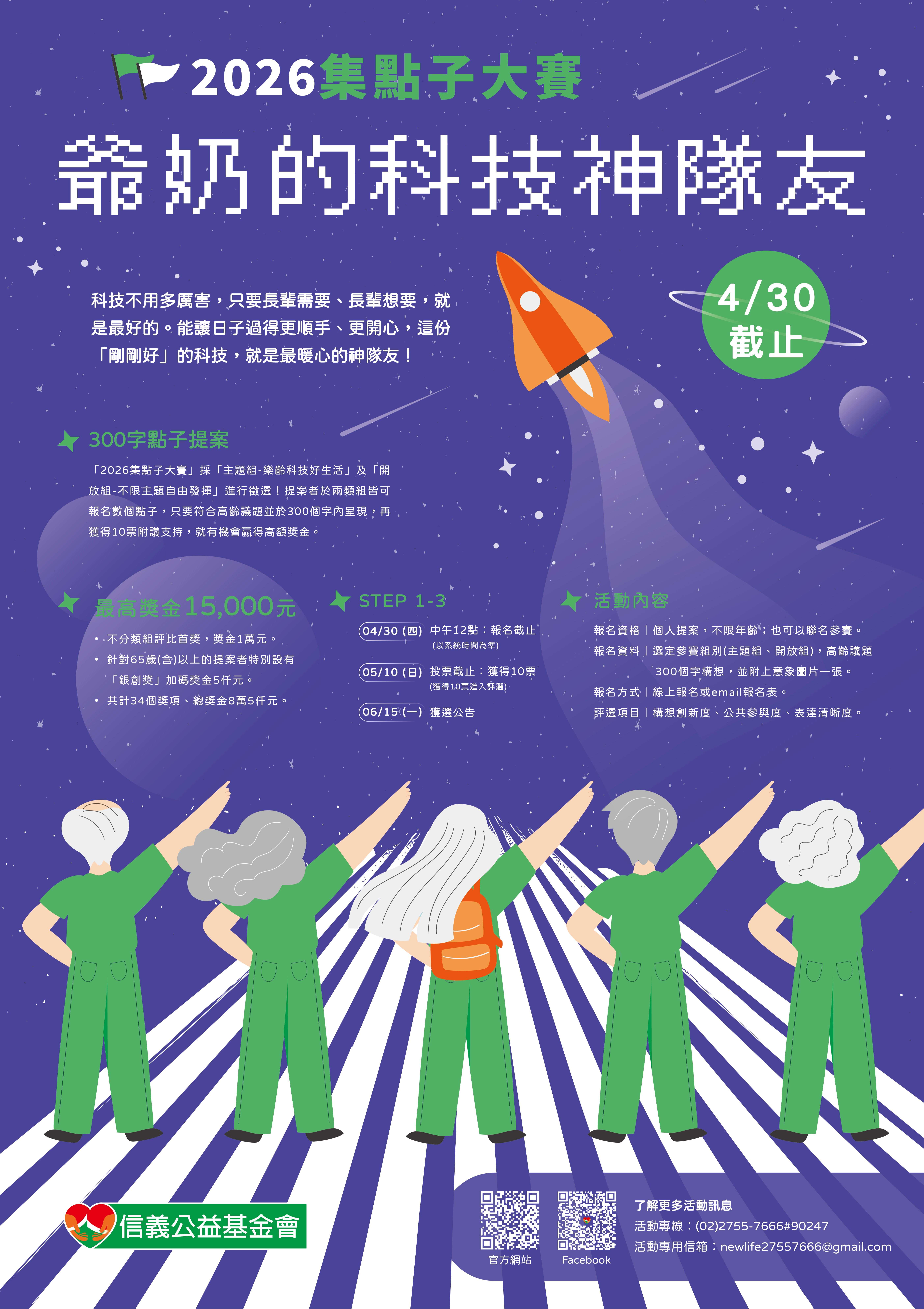 一、財團法人信義公益基金會辦理「集點子大賽」是以高齡議題為主體,鼓勵全民共同參與的競賽活動;徵選具創意巧思及影響力的構想,期能藉由大眾的創意翻轉社會大眾對老年的刻板印象,幫助銀髮族群活出老有所用的生活態度。
