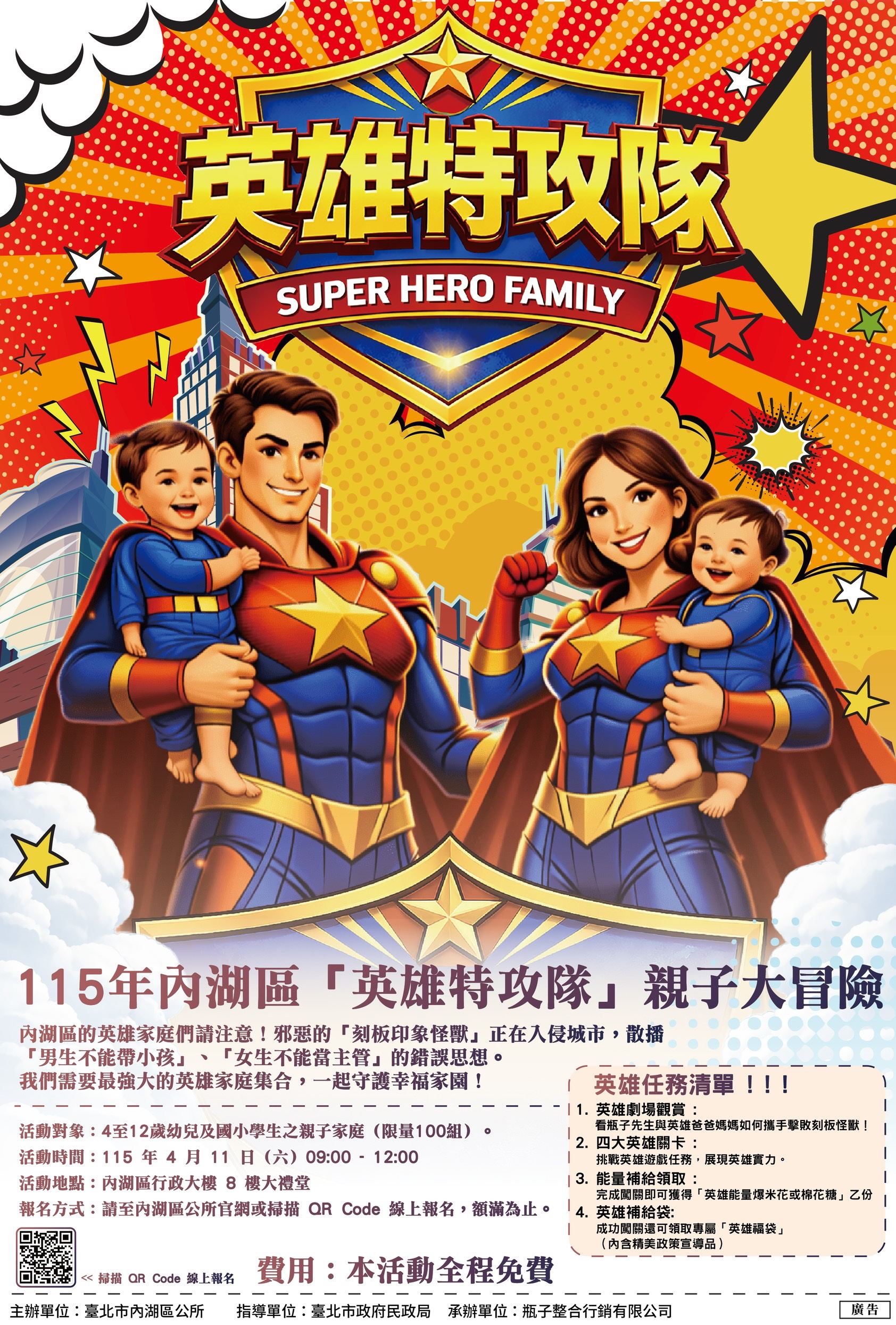 內湖英雄特攻隊徵召中!115年4月11日一起擊敗刻板印象怪獸。活動包含魔術劇場、英雄闖關摸彩及限量能量補給甜點,帶孩子體驗不一樣的英雄特訓!詳情及報名請上內湖區公所官網查詢,手刀報名去!https://www.beclass.com/rid=30525dc69b7a7f1b2ce1