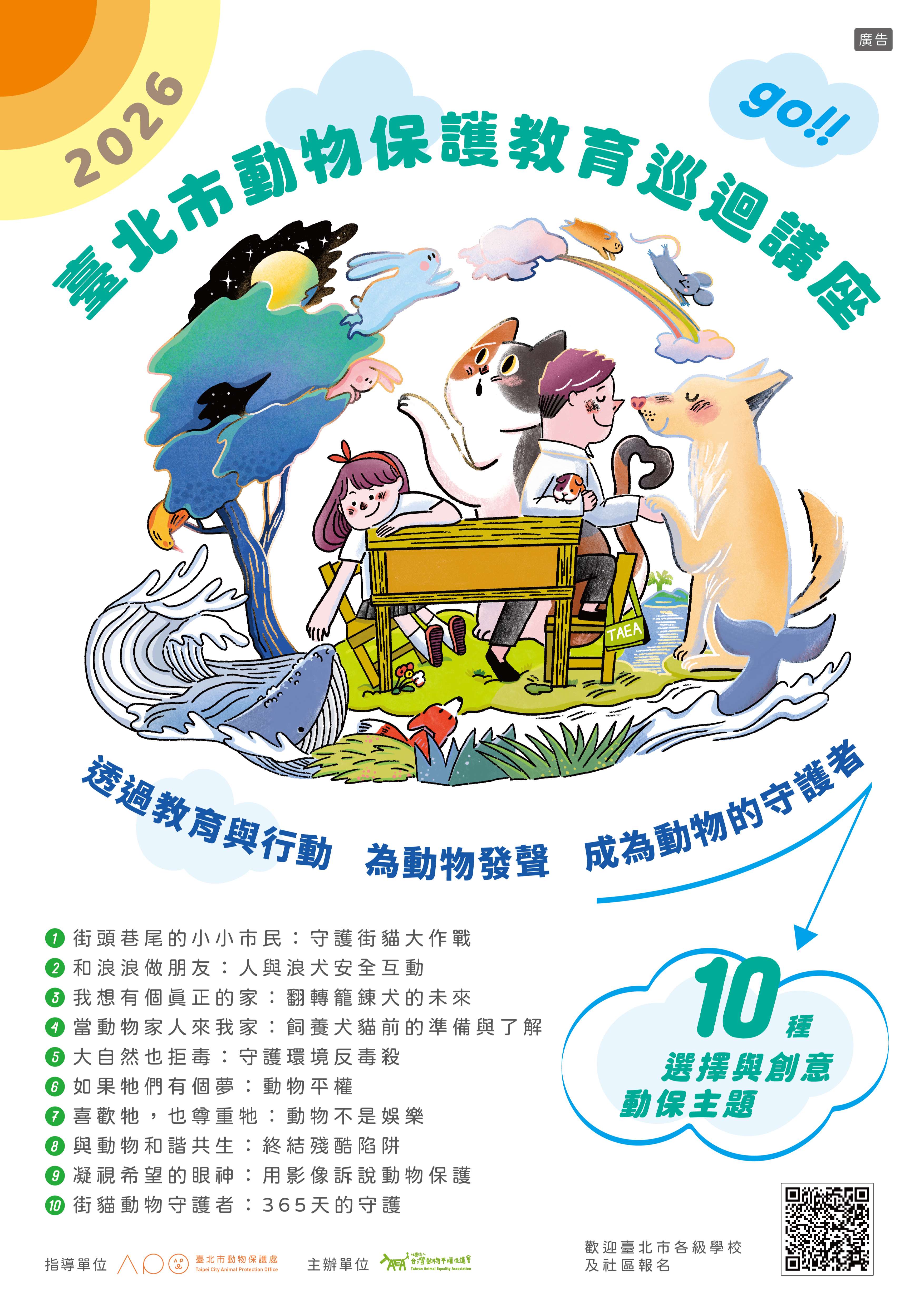 二、為推廣本市動物保護及生命教育工作,本處115年度補助旨 揭團體辦理「2026年度動物保護教育巡迴講座計畫」,該 計畫提供本市幼稚園至大學及社區大學免費參與(每場報 名人數需為20人以上),講座時間可配合各單位安排,報 名資訊及宣傳文宣詳如附件,惠請貴單位踴躍報名。