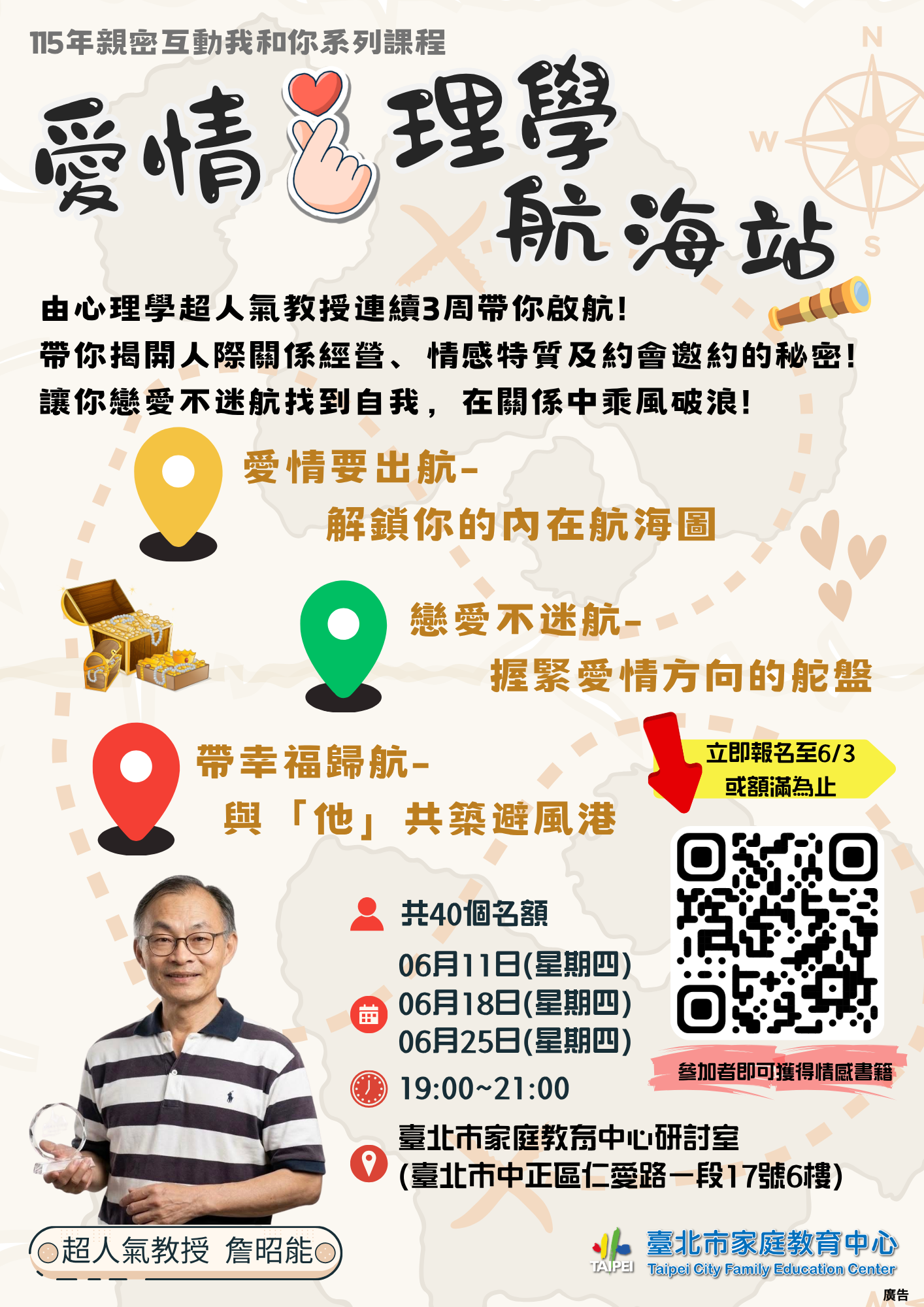 二、活動時間為115年6月11日、6月18日及6月25日,連續3週於 星期四晚間7時至9時,報名自即日起至6月3日或額滿為 止,名額共40位,額滿採候補報名登記制,報名連結如 下:https://forms.gle/pY1wnefH1LRKfemn8。 三、「臺北市家庭教育中心『親密互動我和 你–愛情心理學航海站』課程,於115年6月11日至6月25日 連續3週於星期四晚間7時至9時,假臺北市家庭教育中心舉辦,活動名額為40人,活動全程免費參與,詳細內容可於 中心網站(https://family.gov.taipei)課程與活動瀏覽 及下載, 相關報名問題請洽25419690轉605」。
